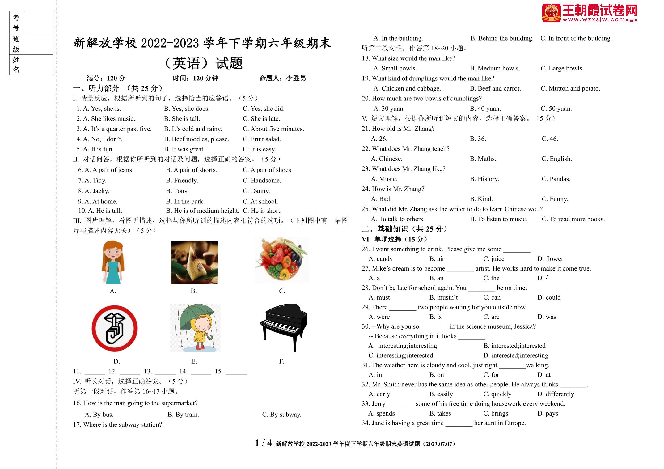 吉林省长春市新解放学校2022-2023学年下学期期末试题六年级英语(外研版)【无听力音频】