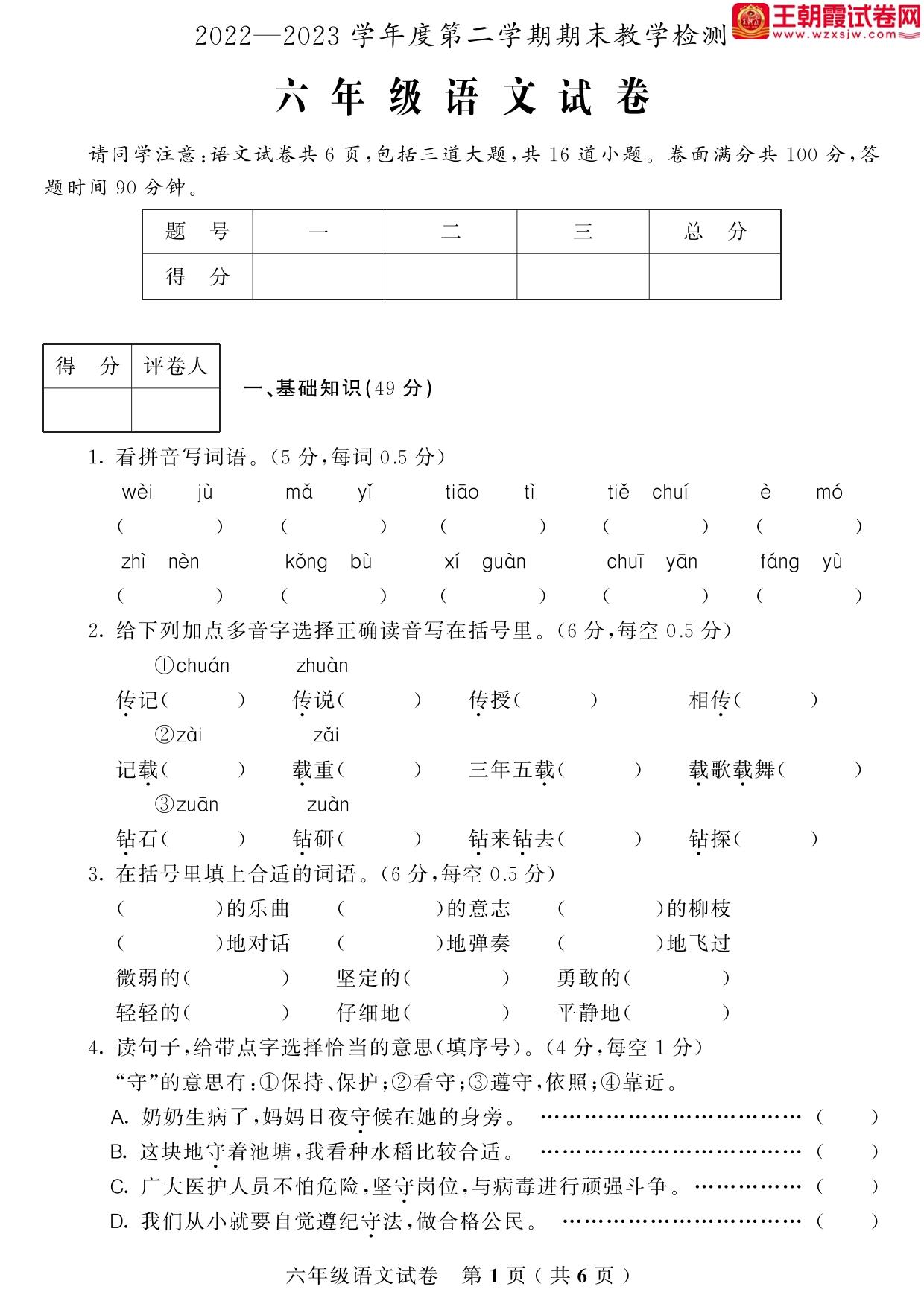 吉林省吉林市磐石市2022-2023学年度第二学期期末教学检测六年级语文(人教版)