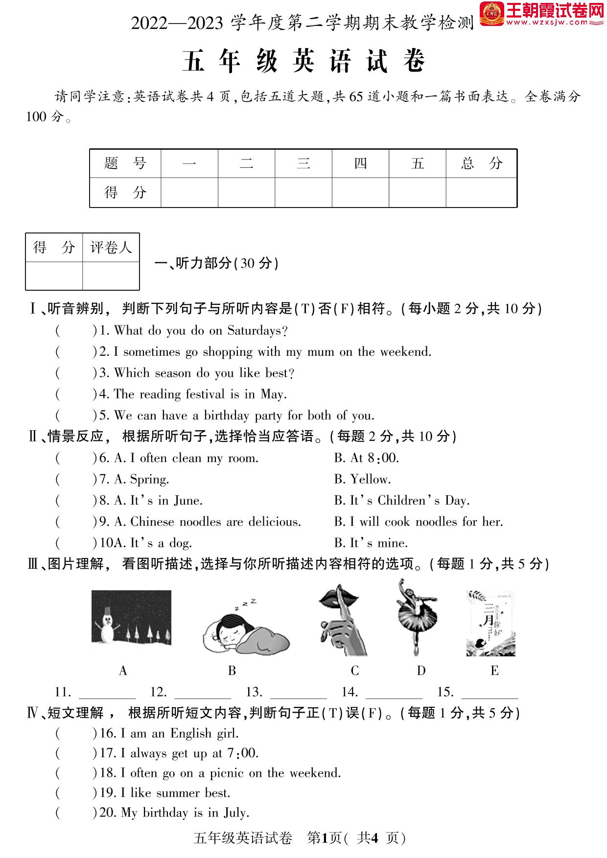 吉林省吉林市磐石市2022-2023学年度第二学期期末教学检测五年级英语(人教PEP版)【无听力音频】