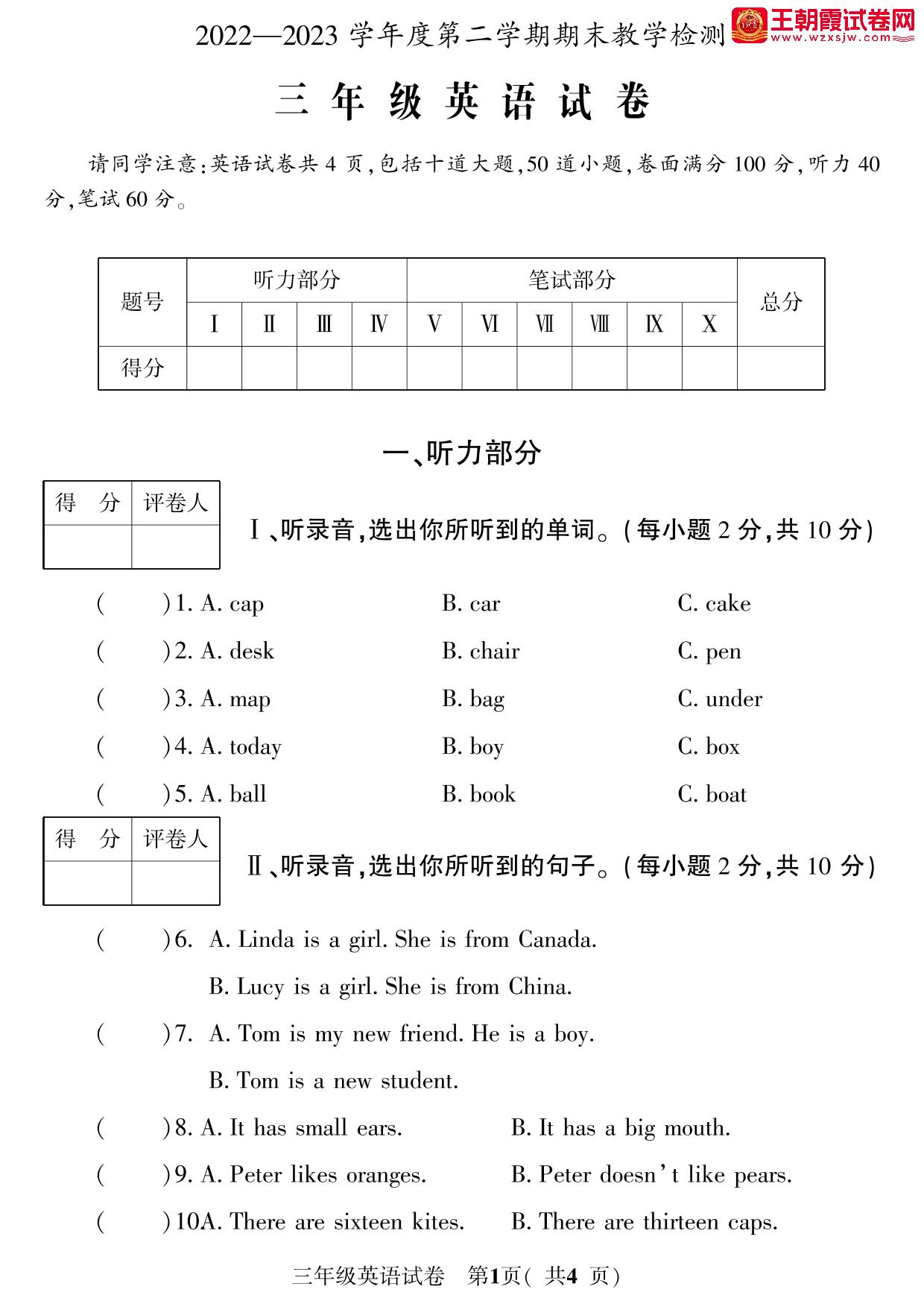 吉林省吉林市磐石市2022-2023学年度第二学期期末教学检测三年级英语(人教PEP版)【无听力音频】