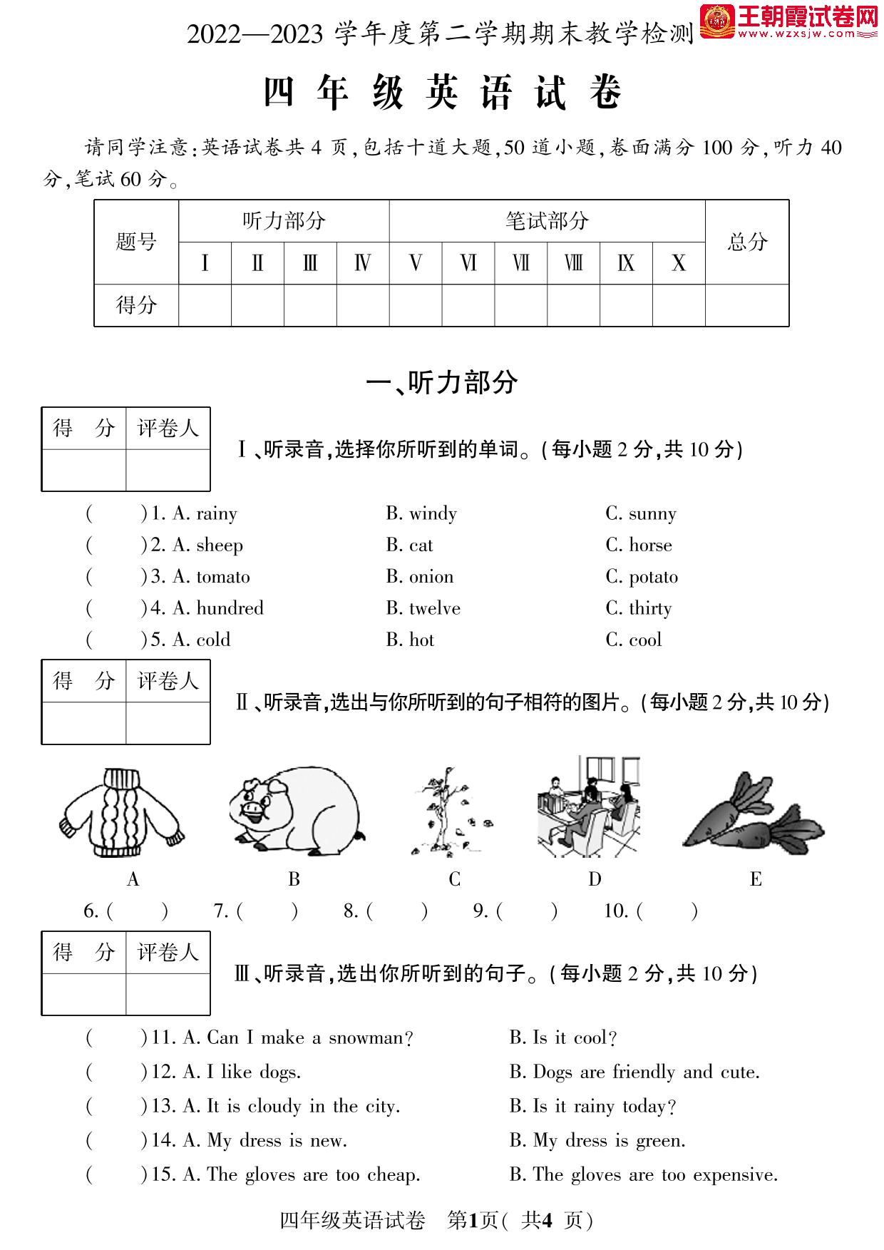 吉林省吉林市磐石市2022-2023学年度第二学期期末教学检测四年级英语(人教PEP版)【无听力音频】