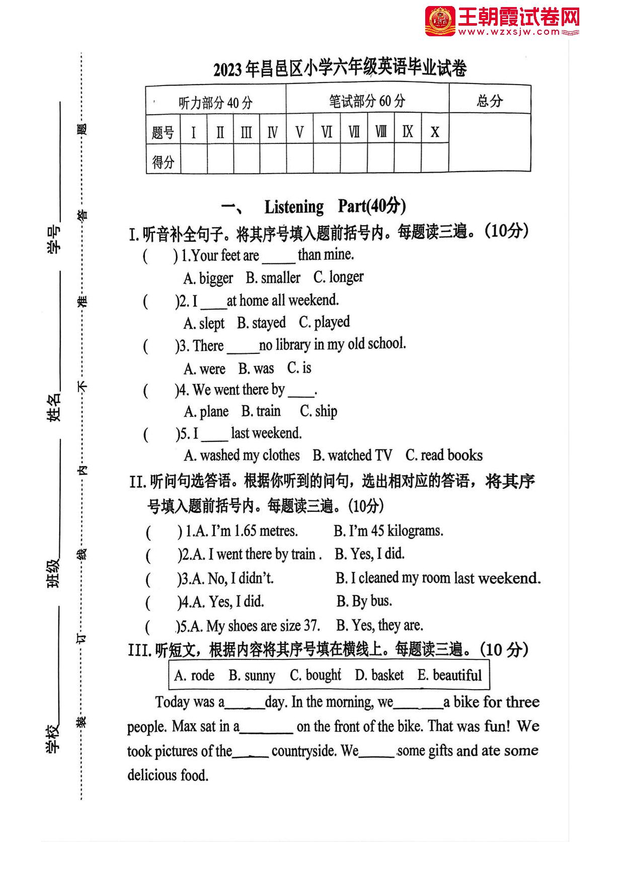 吉林省吉林市昌邑区2023年毕业试卷六年级英语(人教PEP版)【无听力音频】
