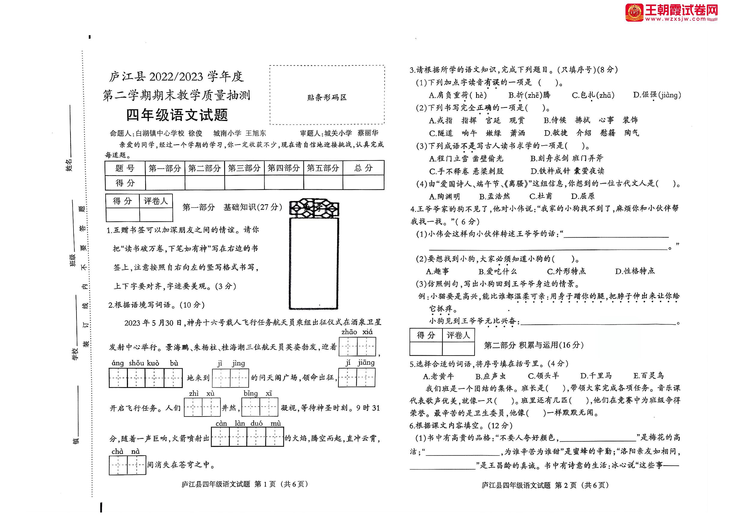 安徽省合肥市庐江县2022-2023学年第二学期期末教学质量抽测四年级语文(人教版)