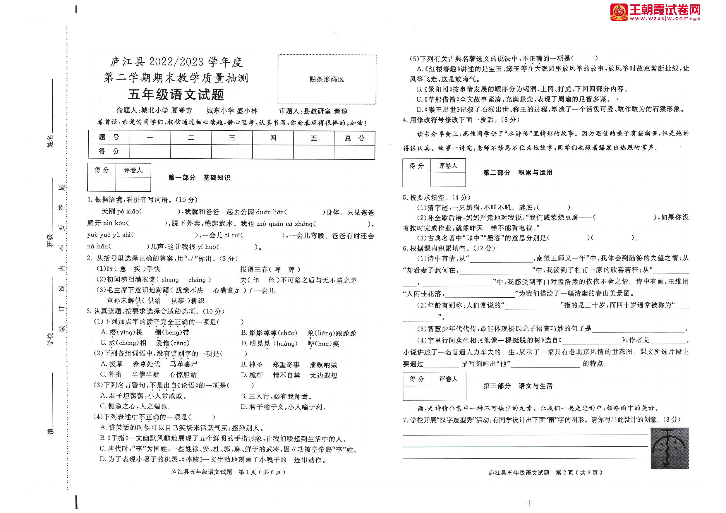 安徽省合肥市庐江县2022-2023学年第二学期期末教学质量抽测五年级语文(人教版)