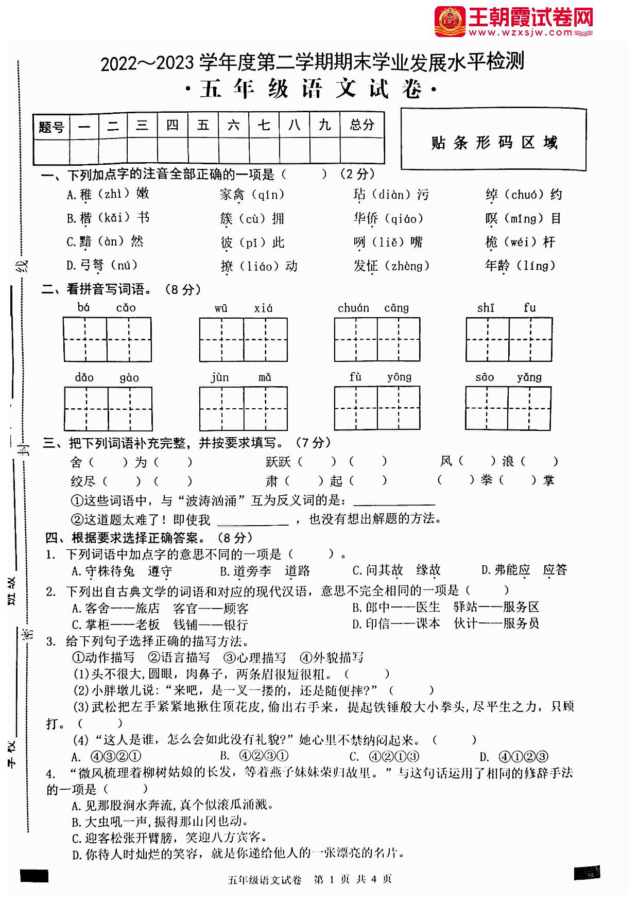 安徽省芜湖市无为市2022-2023学年度第二学期期末学业发展水平检测五年级语文(人教版)