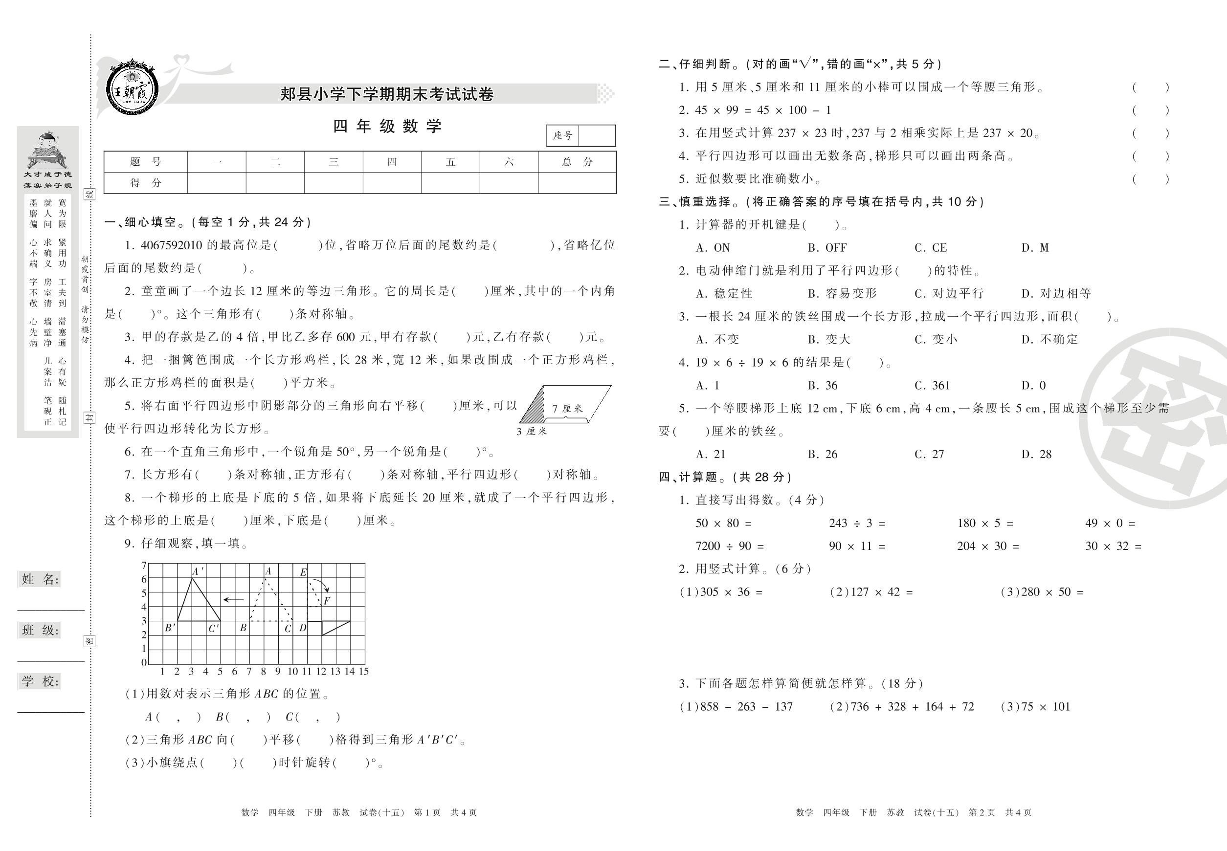 2015-2016学年第二学期平顶山市郏县四年级数学试卷(苏教版)【15】