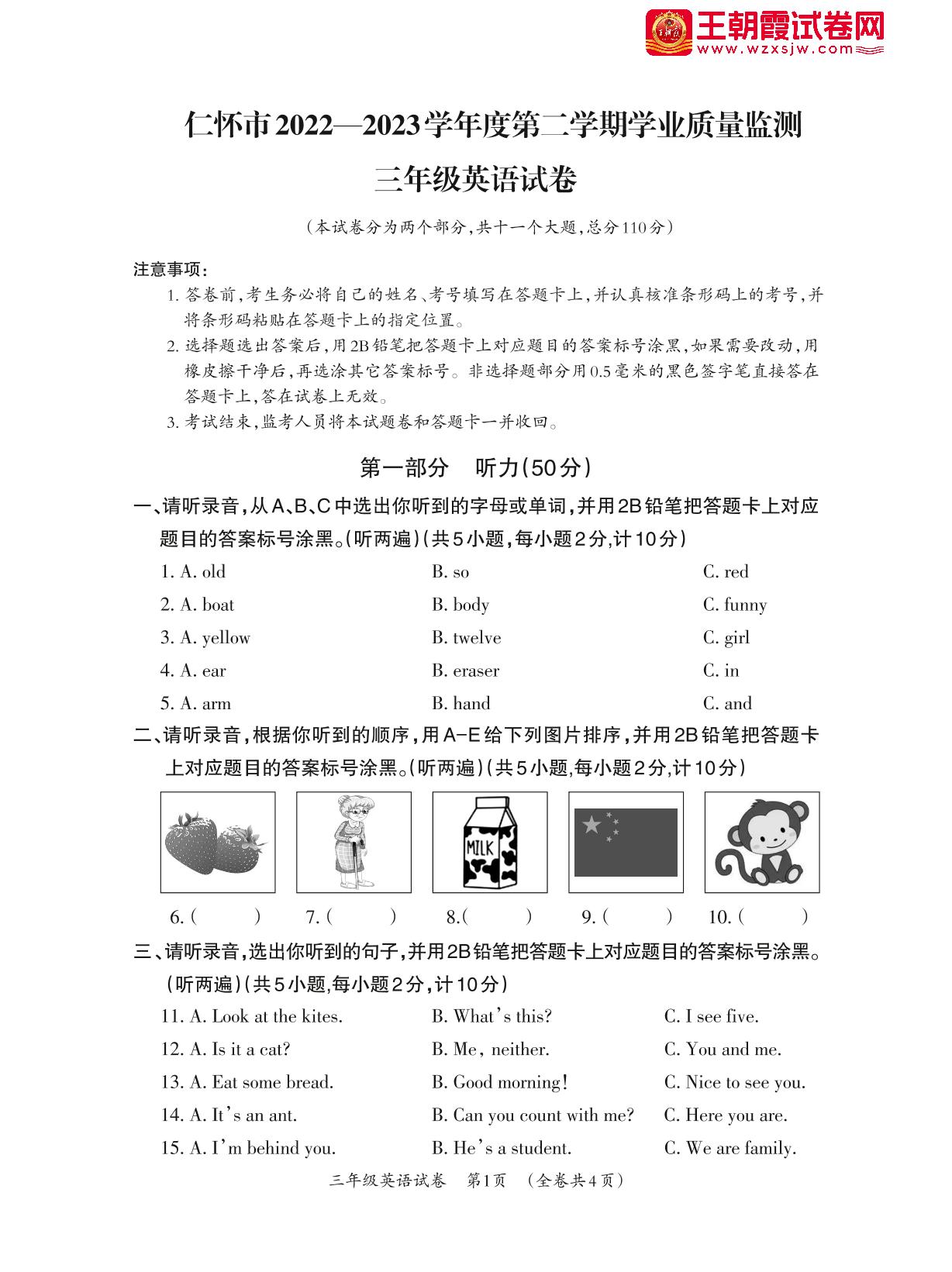 贵州省遵义市仁怀市2022-2023学年度第二学期期末学业质量监测试卷三年级英语(人教PEP版)