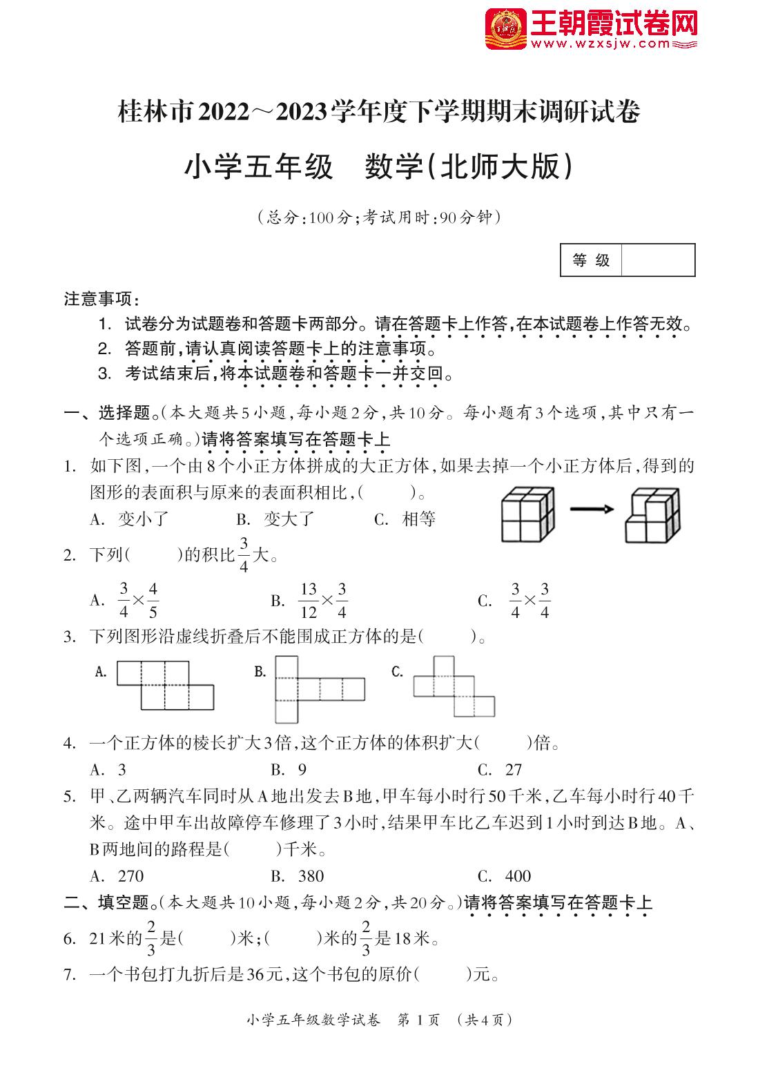 广西壮族自治区桂林市2022-2023学年度下学期期末调研试卷五年级数学(北师版)
