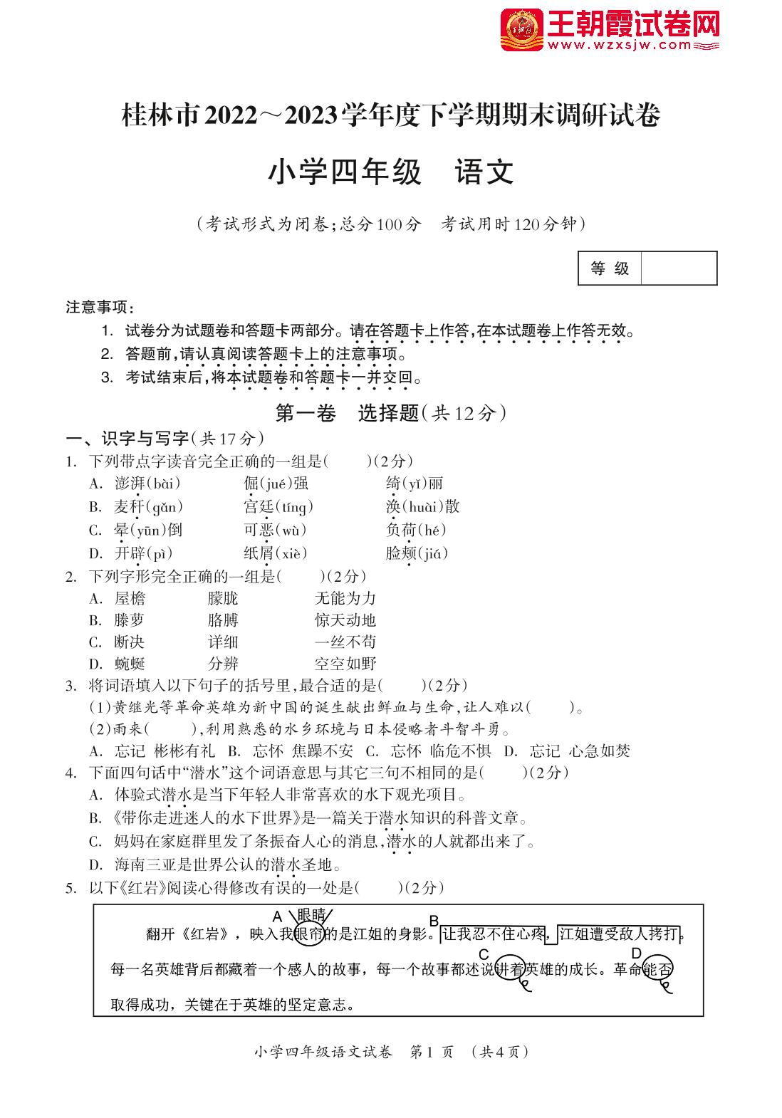 广西壮族自治区桂林市2022-2023学年度下学期期末调研试卷四年级语文(人教版)