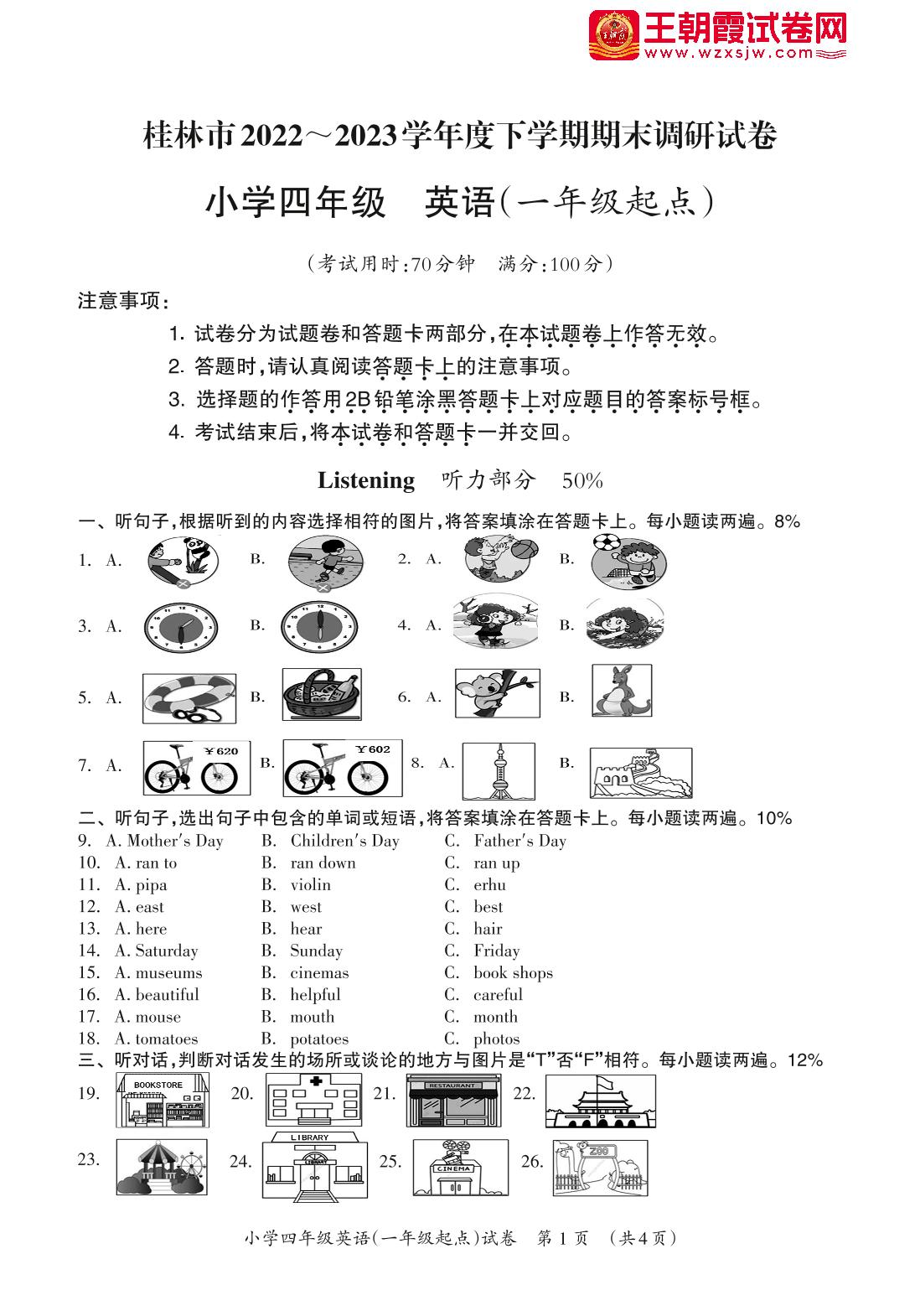 广西壮族自治区桂林市2022-2023学年度下学期期末调研试卷四年级英语(外研版·一起始)【无听力音频】