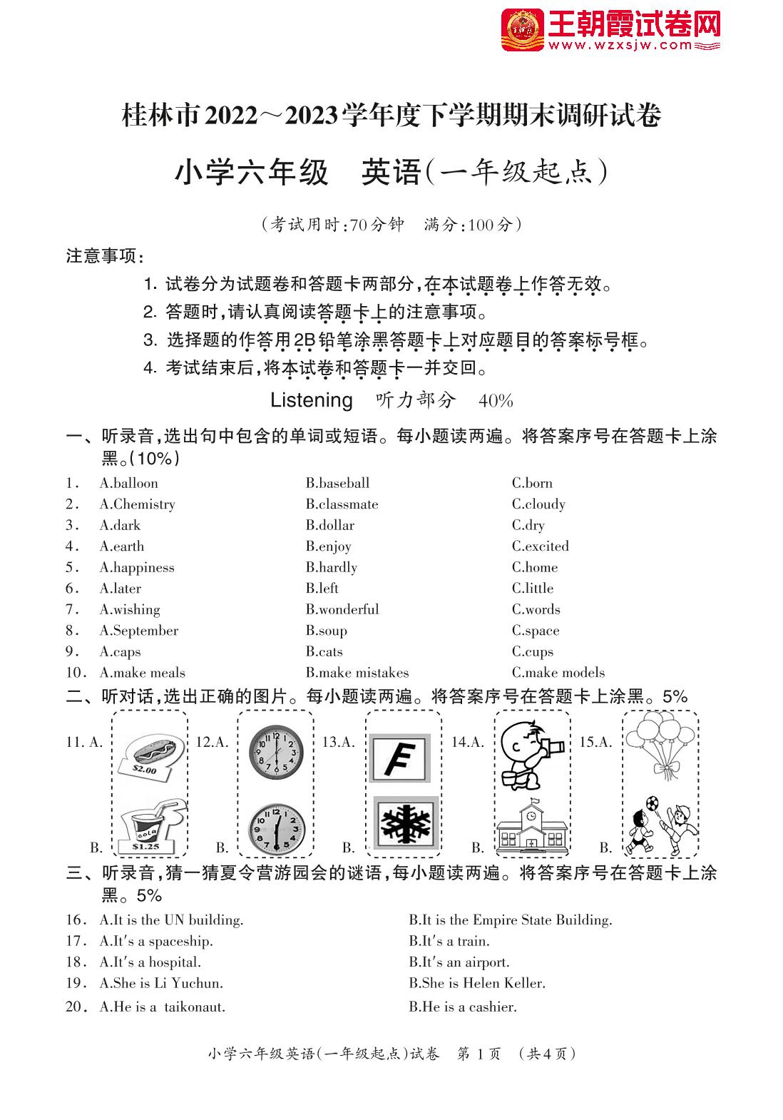 广西壮族自治区桂林市2022-2023学年度下学期期末调研试卷六年级英语(外研版·一起始)【无听力音频】
