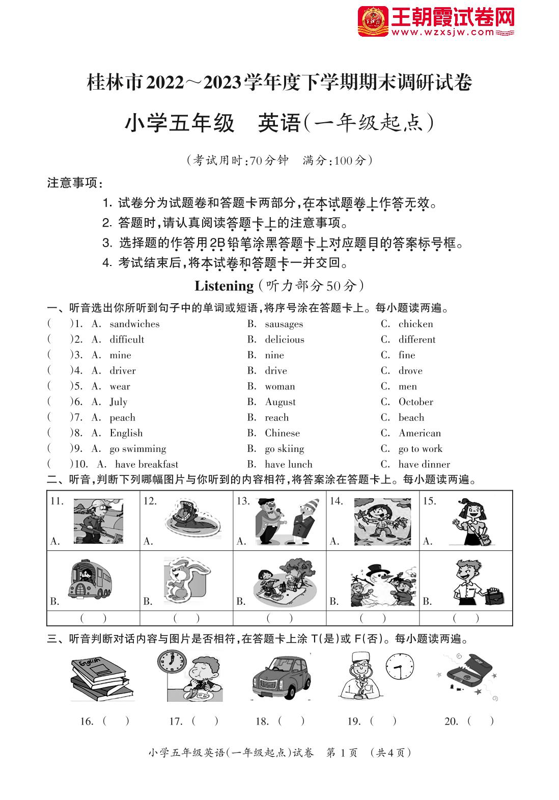 广西壮族自治区桂林市2022-2023学年度下学期期末调研试卷五年级英语(外研版·一起始)【无听力音频】