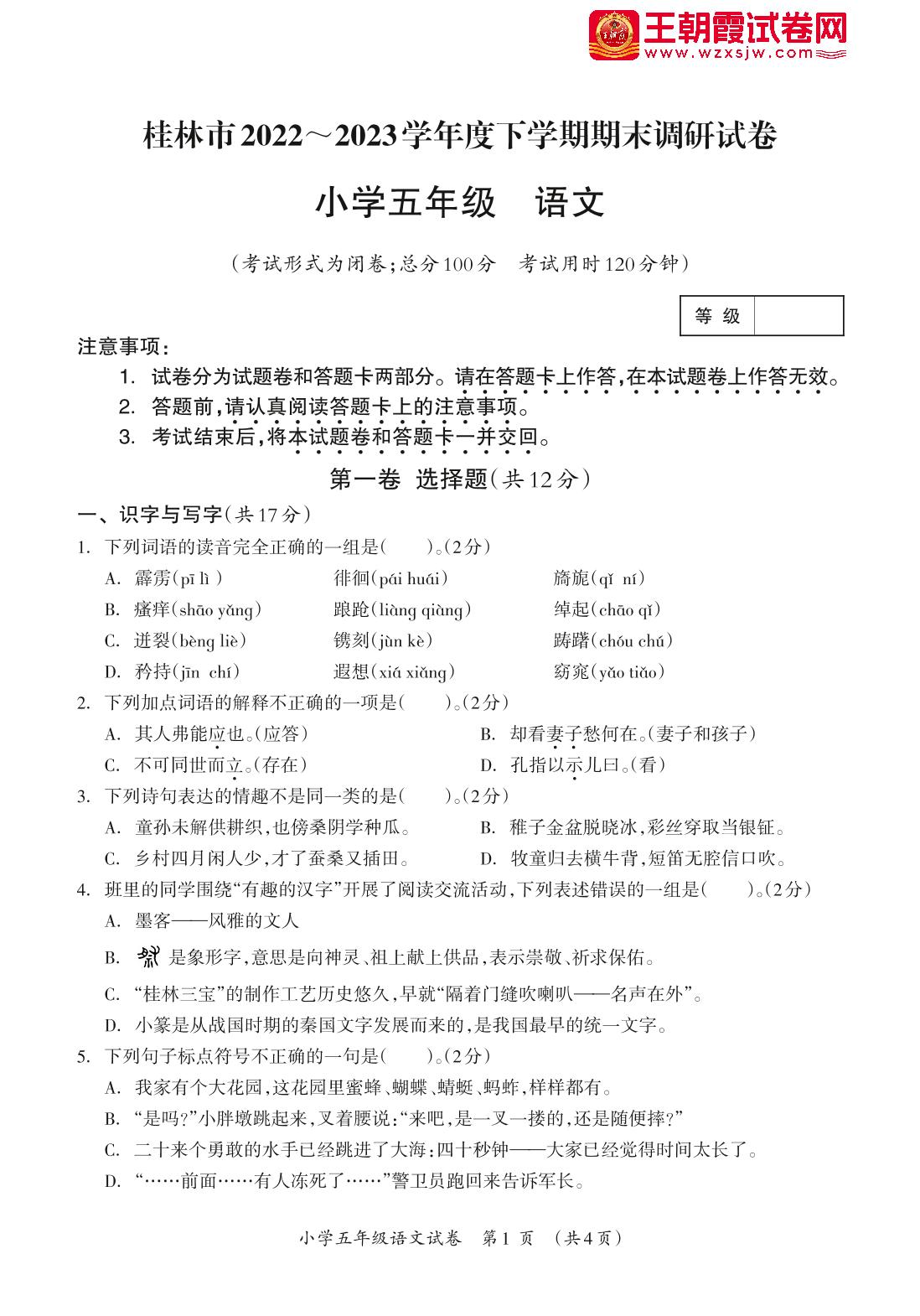 广西壮族自治区桂林市2022-2023学年度下学期期末调研试卷五年级语文(人教版)