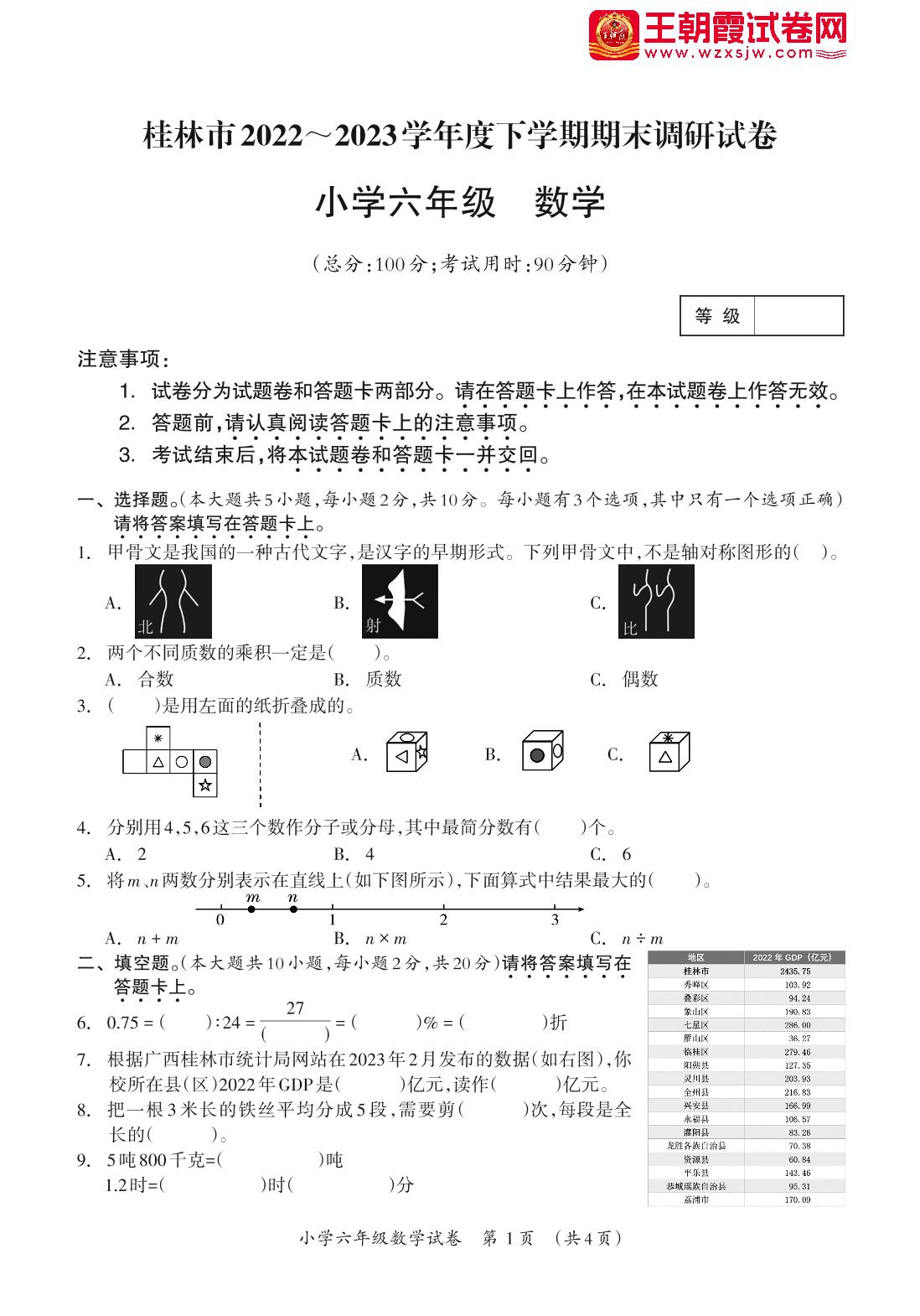 广西壮族自治区桂林市2022-2023学年度下学期期末调研试卷六年级数学(北师版)