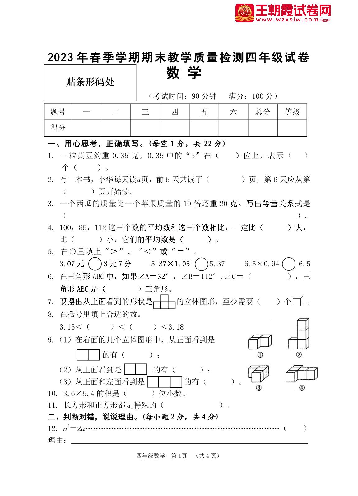 广西壮族自治区贺州市2022-2023学年度下学期期末教学质量检测试卷四年级数学(北师版)