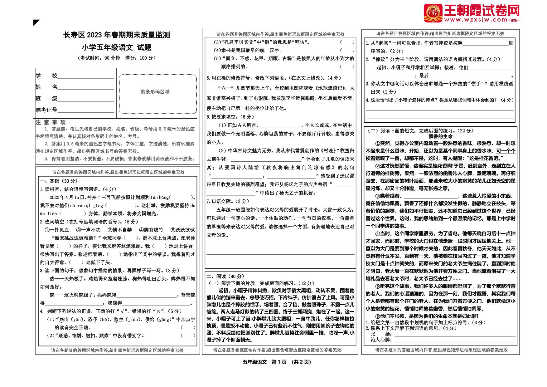 重庆长寿区2022-2023学年下学期期末质量监测五年级语文(人教版)