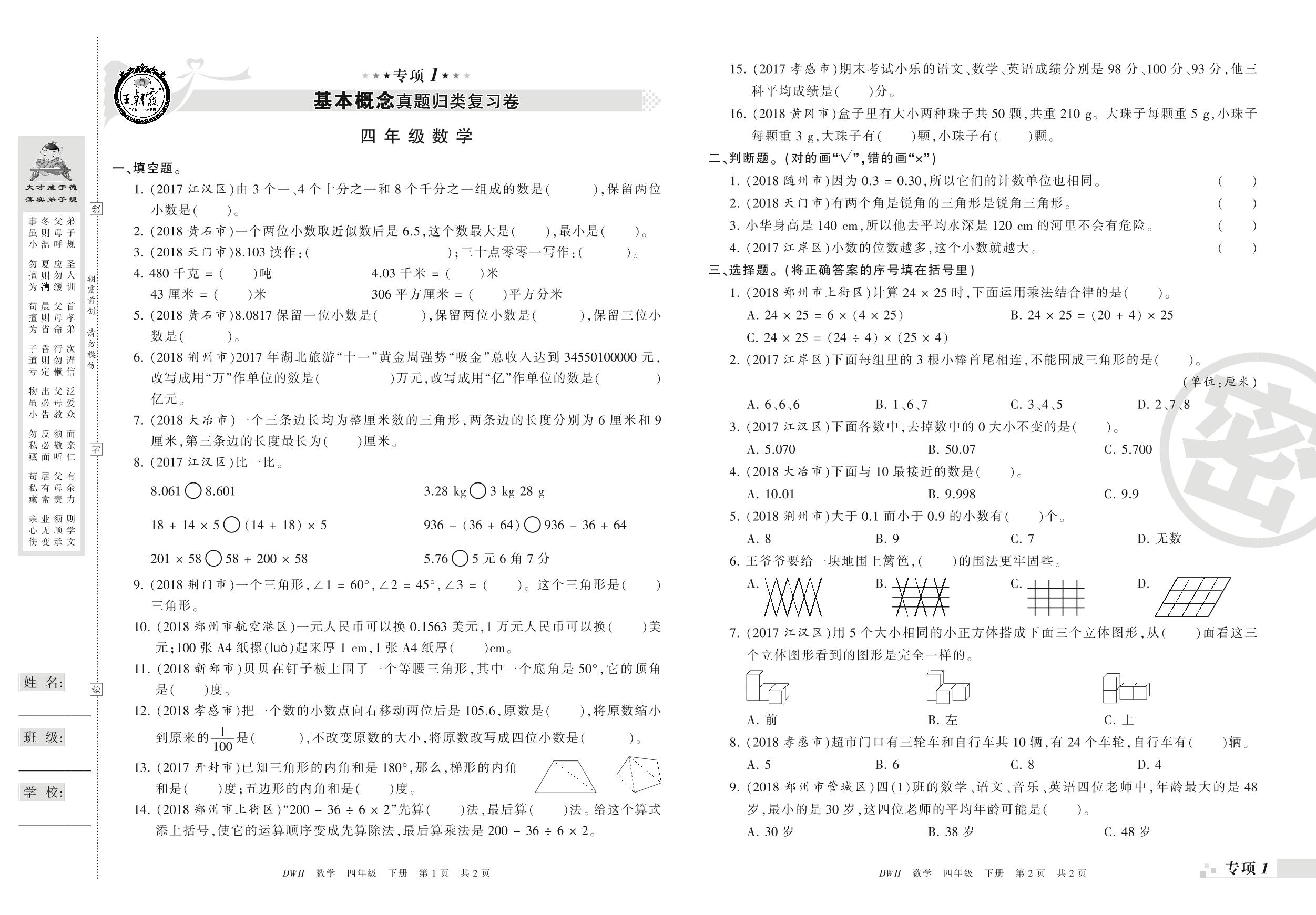 王朝霞期末专项卷——基本概念、计算真题归类复习卷四年级下册数学(人教版)_R210804150246【0】