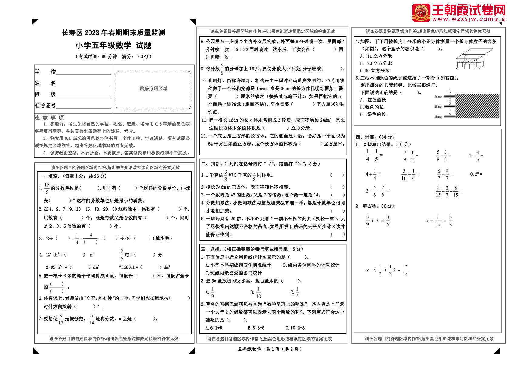 重庆市长寿区2022-2023学年下学期期末质量监测五年级数学(人教版)
