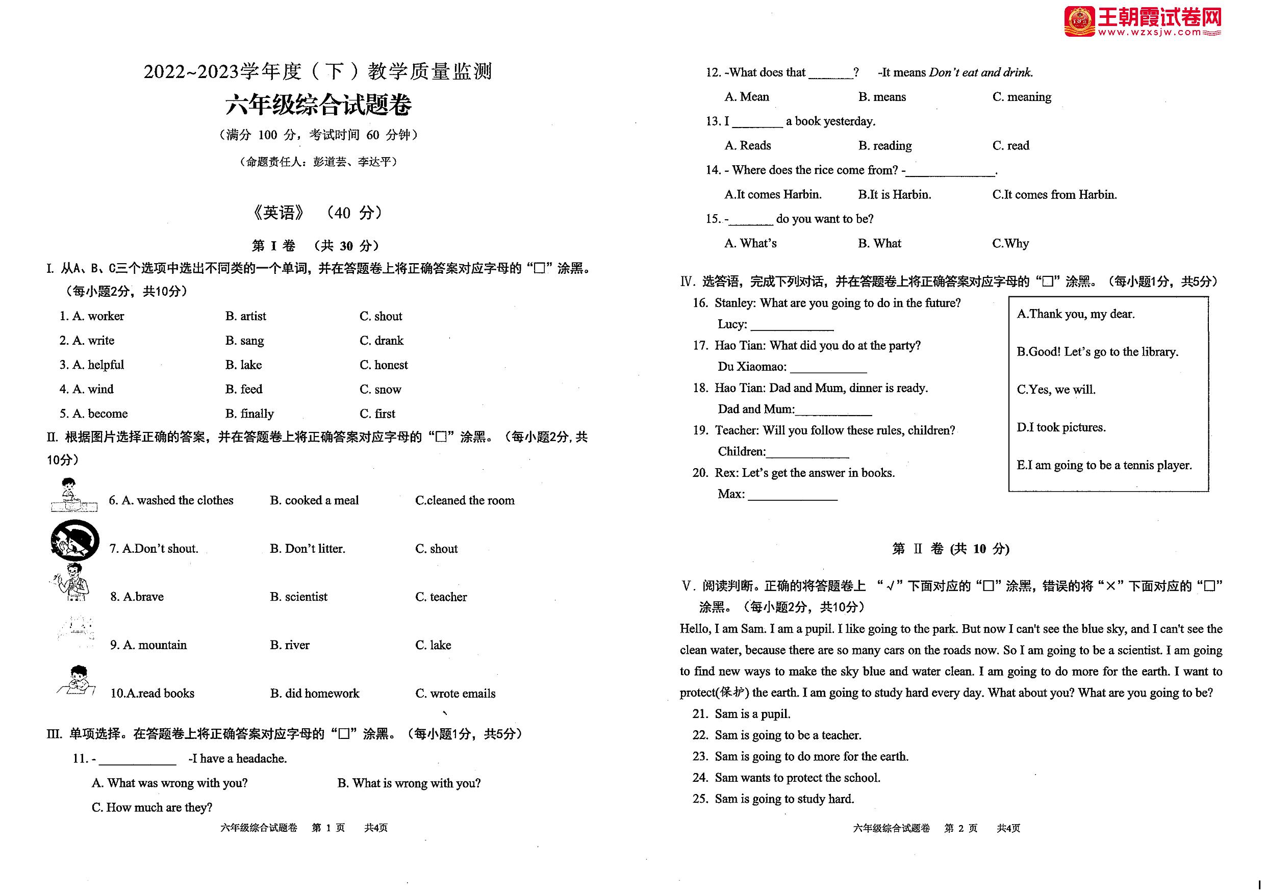 重庆市万州区2022-2023学年度下学期期末教学质量监测六年级英语道法科学综合试题卷