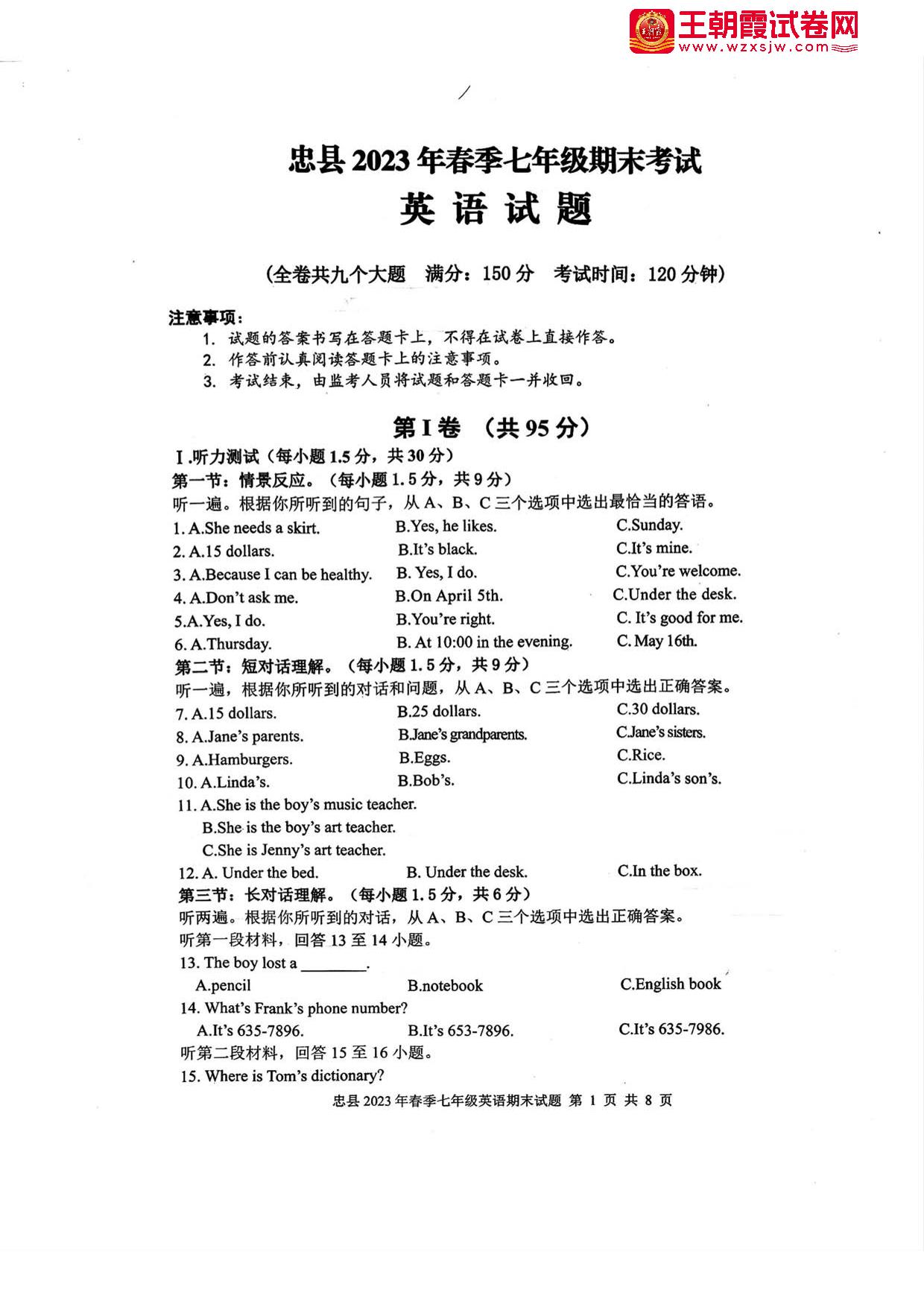 重庆市忠县2022-2023学年下学期期末考试七年级英语(人教版)