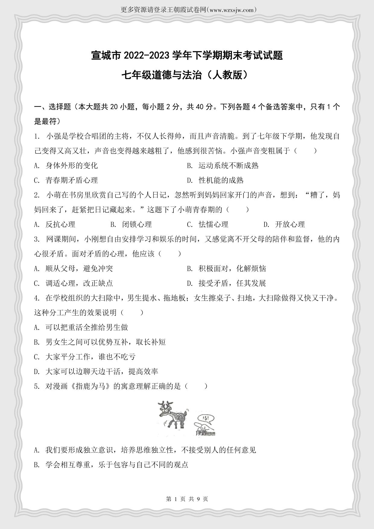 安徽省宣城市2022-2023学年下学期期末考试试题七年级道德与法治(人教版)