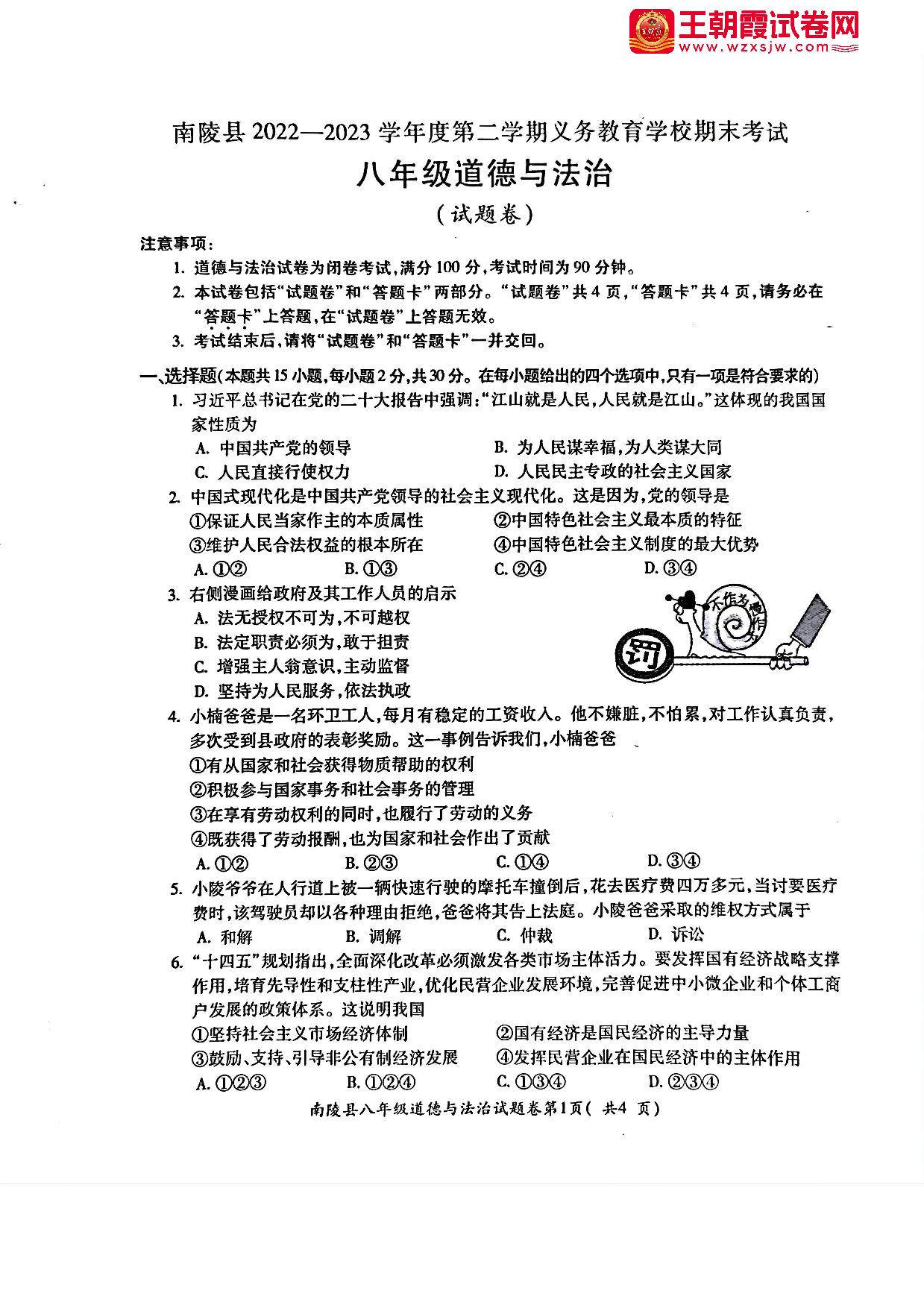 安徽省芜湖市南陵县2022-2023学年度第二学期义务教育学校期末考试八年级道德与法治(人教版)
