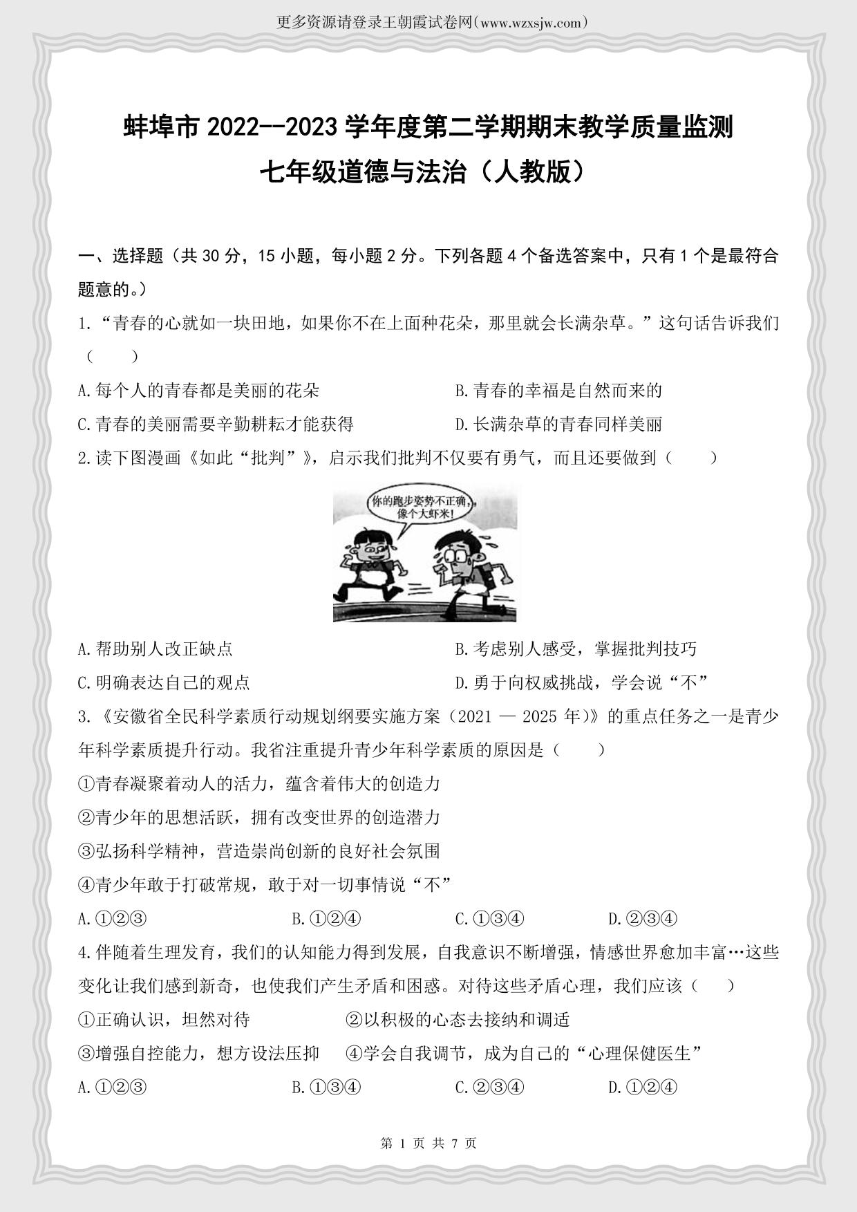 安徽省蚌埠市2022-2023学年度第二学期期末教学质量监测七年级道德与法治(人教版)