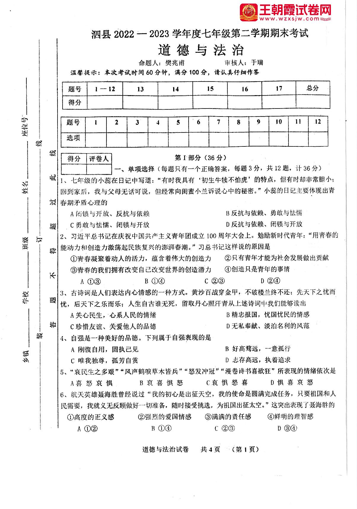 安徽省宿州市泗县2022-2023学年度第二学期期末考试七年级道德与法治(人教版)
