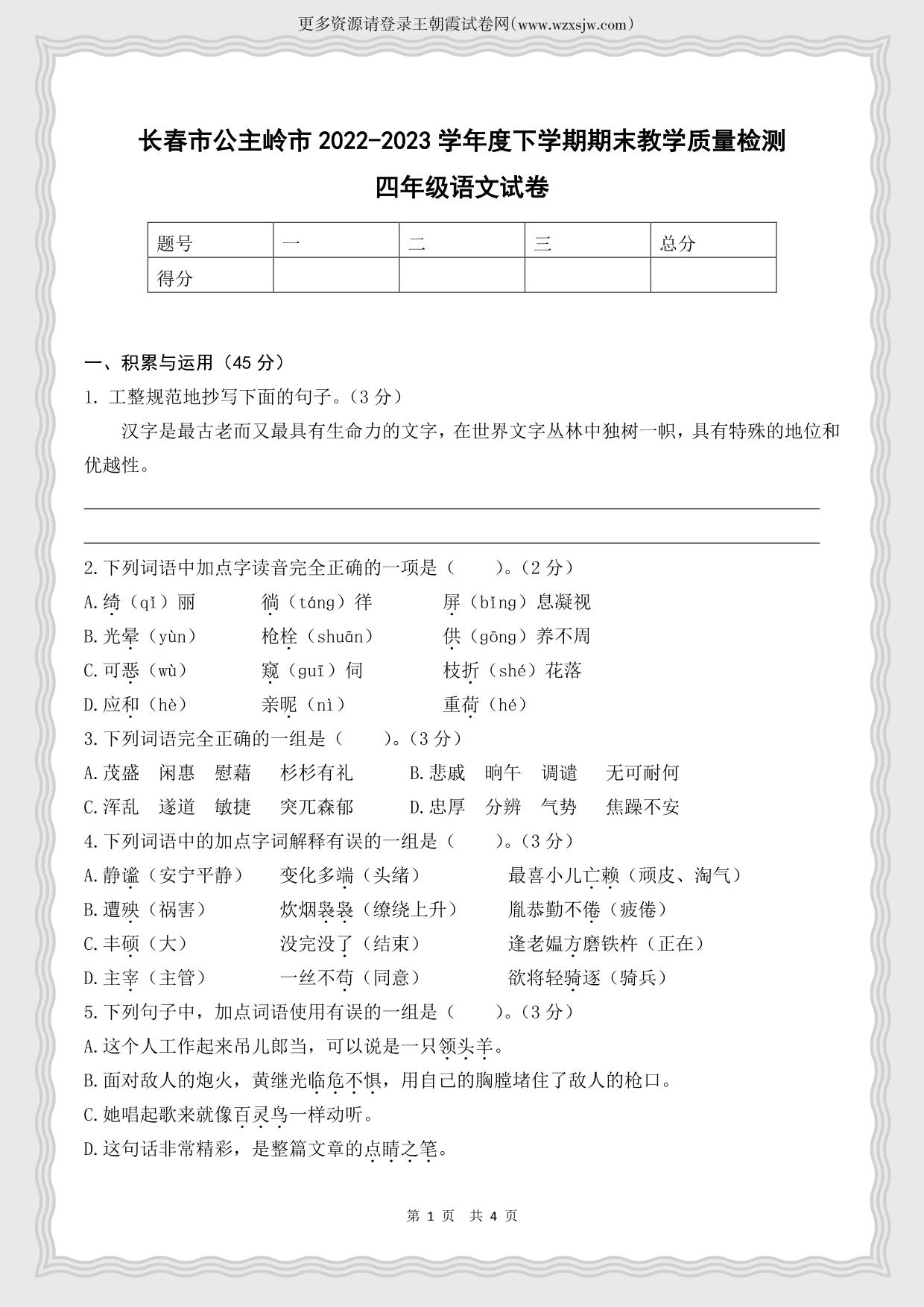 吉林省长春市公主岭市2022-2023学年度下学期期末教学质量检测四年级语文(人教版)