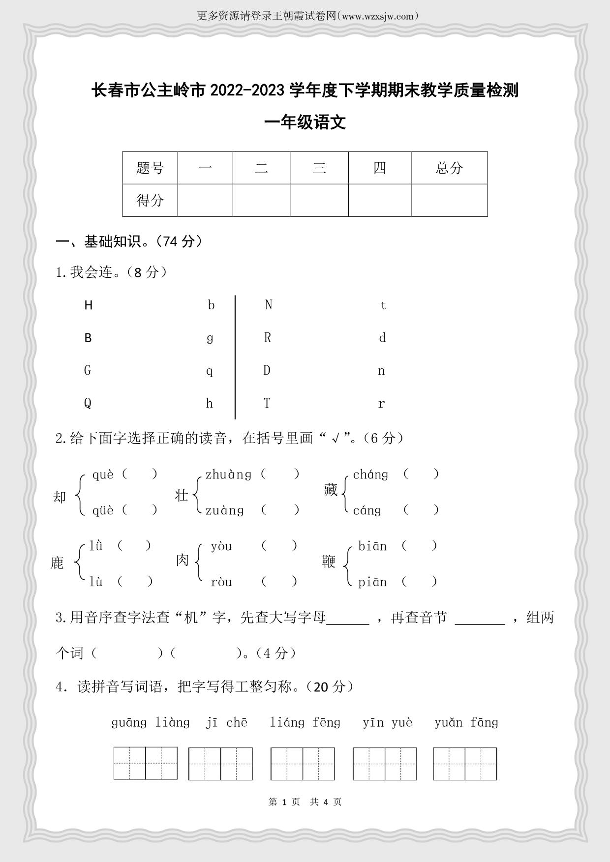 吉林省长春市公主岭市2022-2023学年度下学期期末教学质量检测一年级语文(人教版)