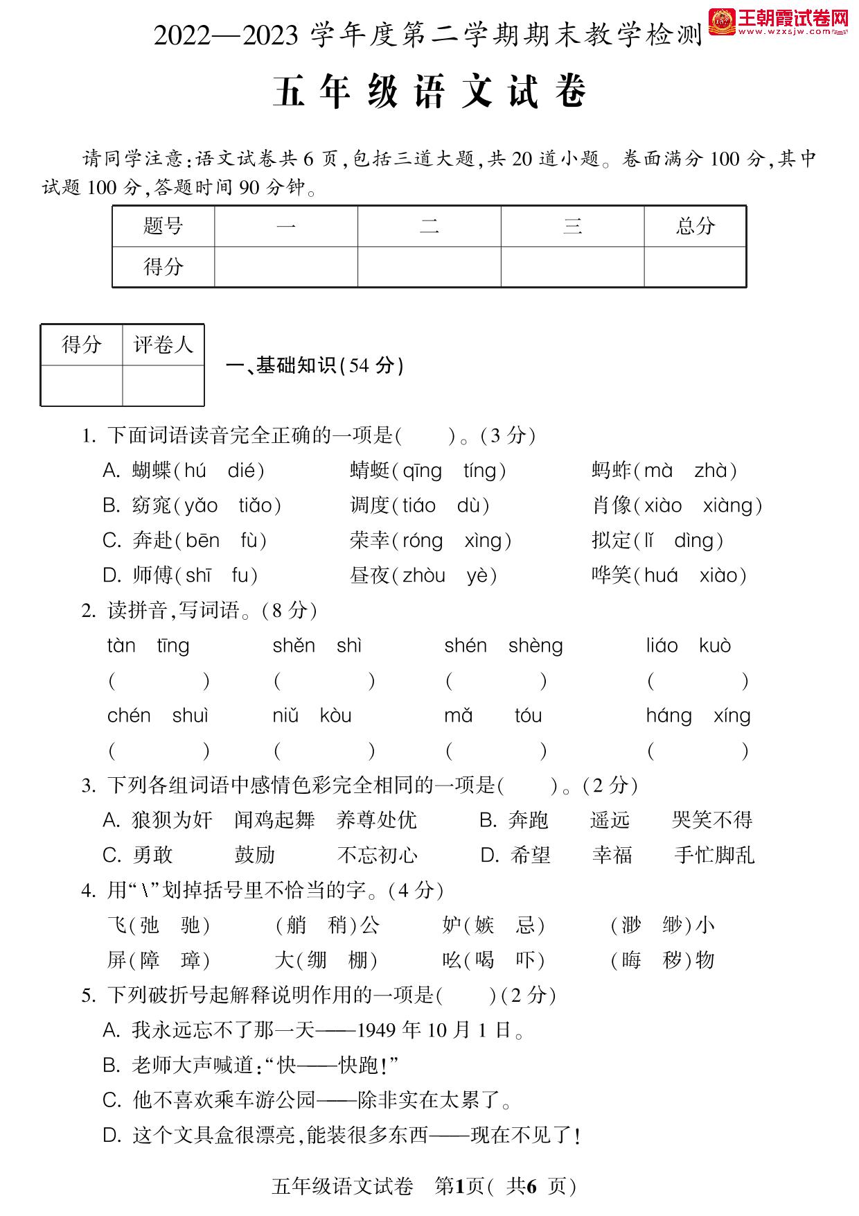 吉林省吉林市磐石市2022-2023学年度第二学期期末教学检测五年级语文(人教版)