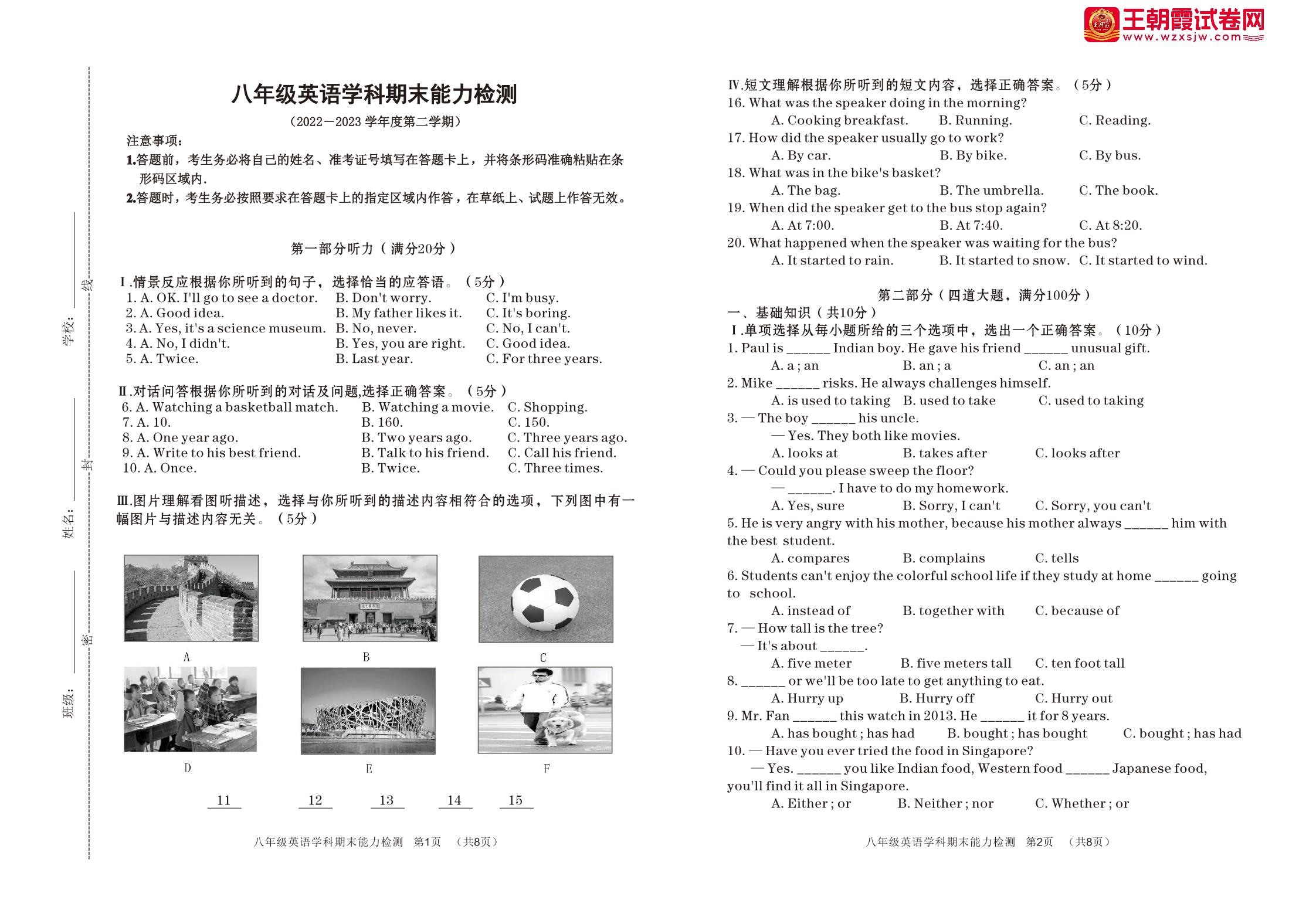 吉林省四平市铁西区2022-2023学年度第二学期期末能力检测八年级英语(人教版)