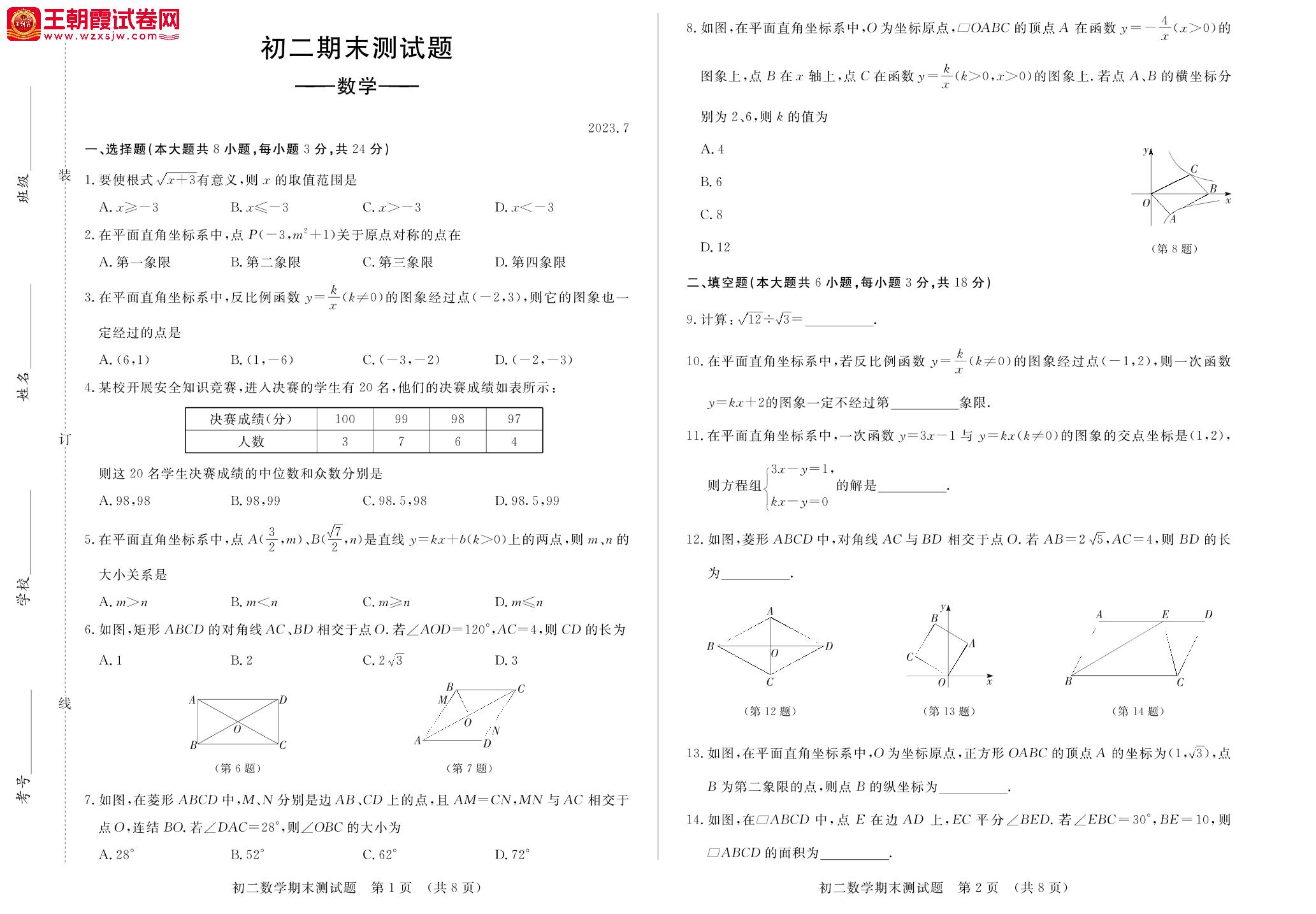 吉林省长春市宽城区2022-2023学年下学期期末测试题八年级数学(华师大版)