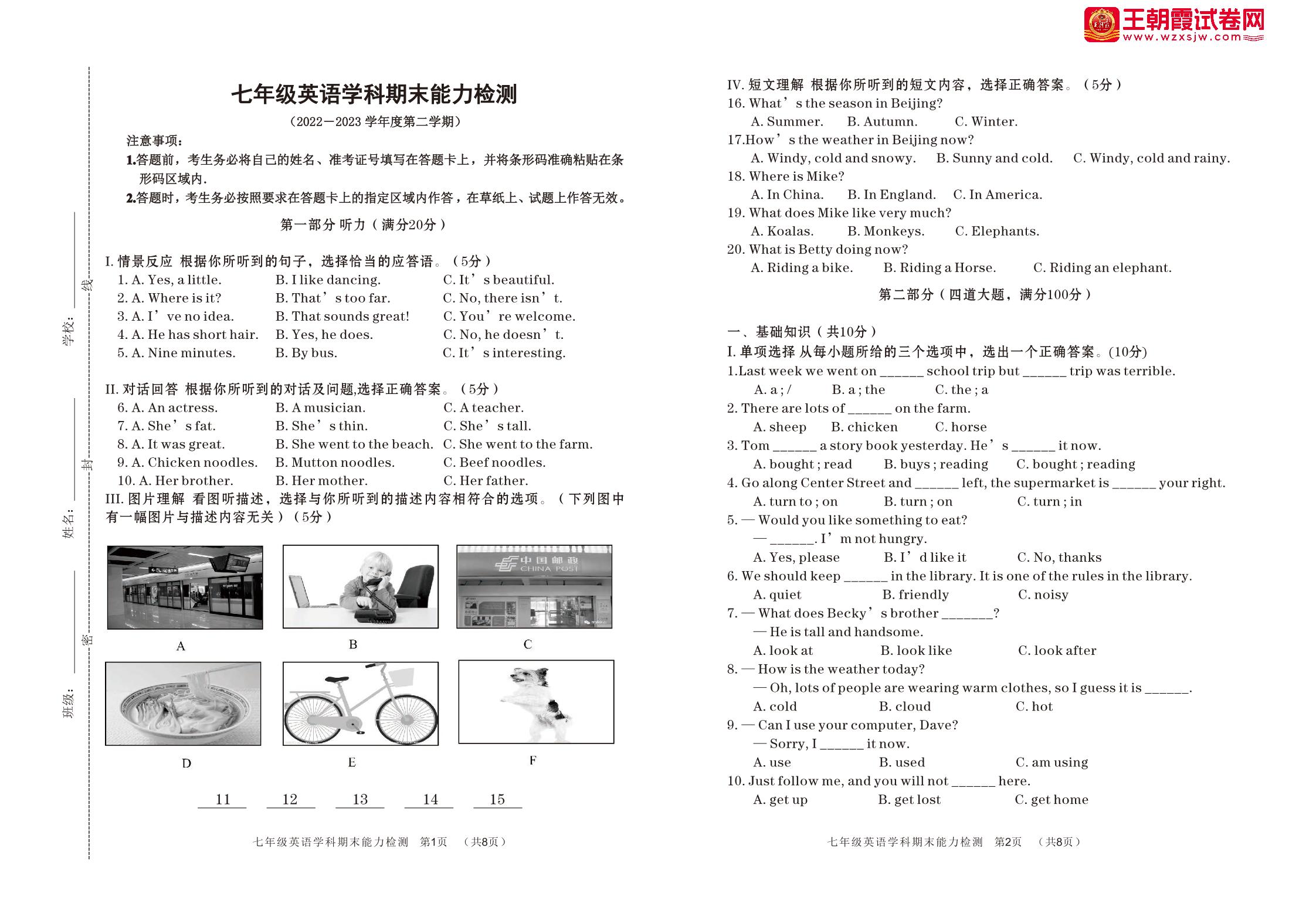 吉林省四平市铁西区2022-2023学年度第二学期期末能力检测七年级英语(人教版)