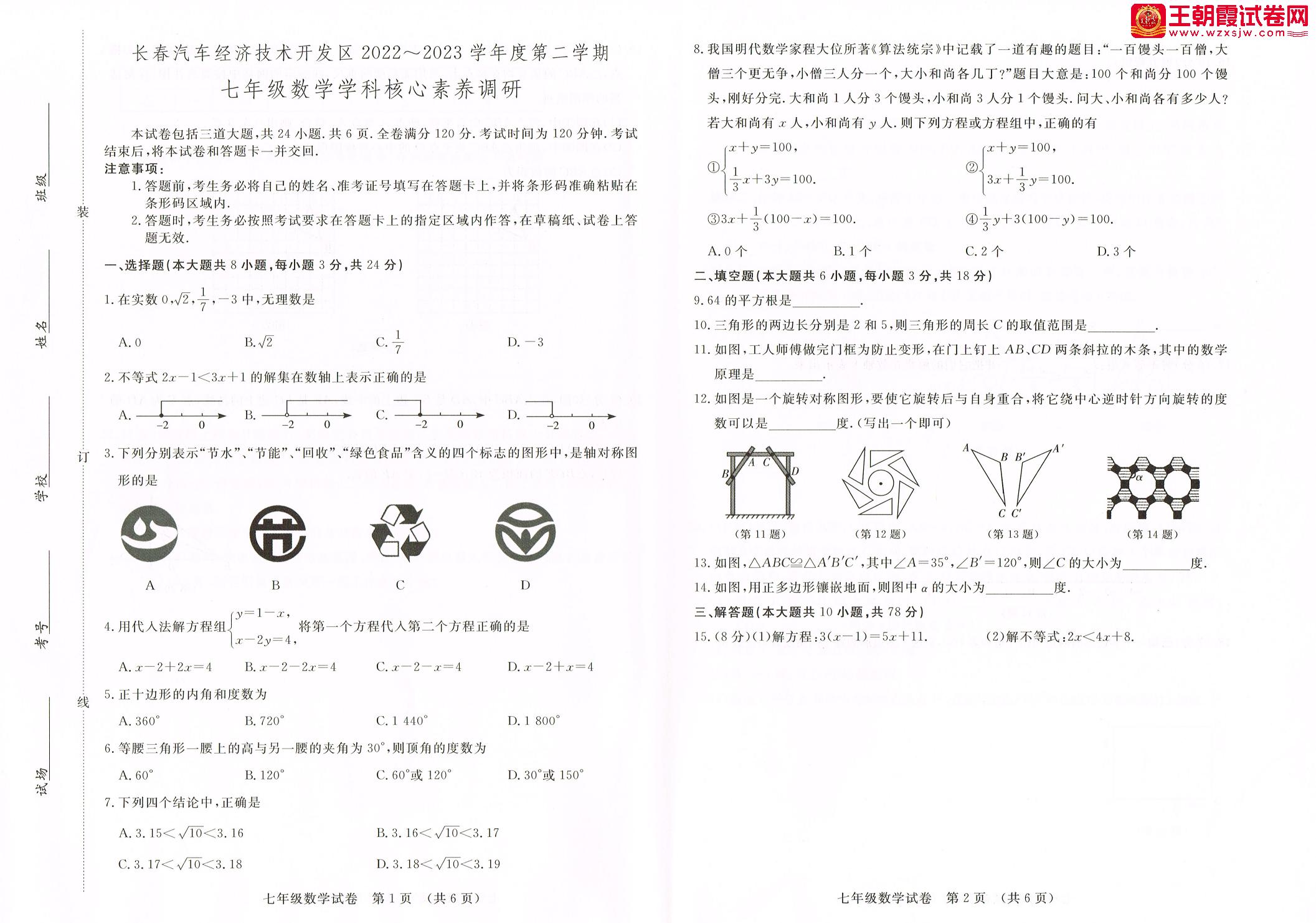 吉林省长春市汽车经济技术开发区2022—2023学年度第二学期期末核心素养调研七年级数学(华师大版)
