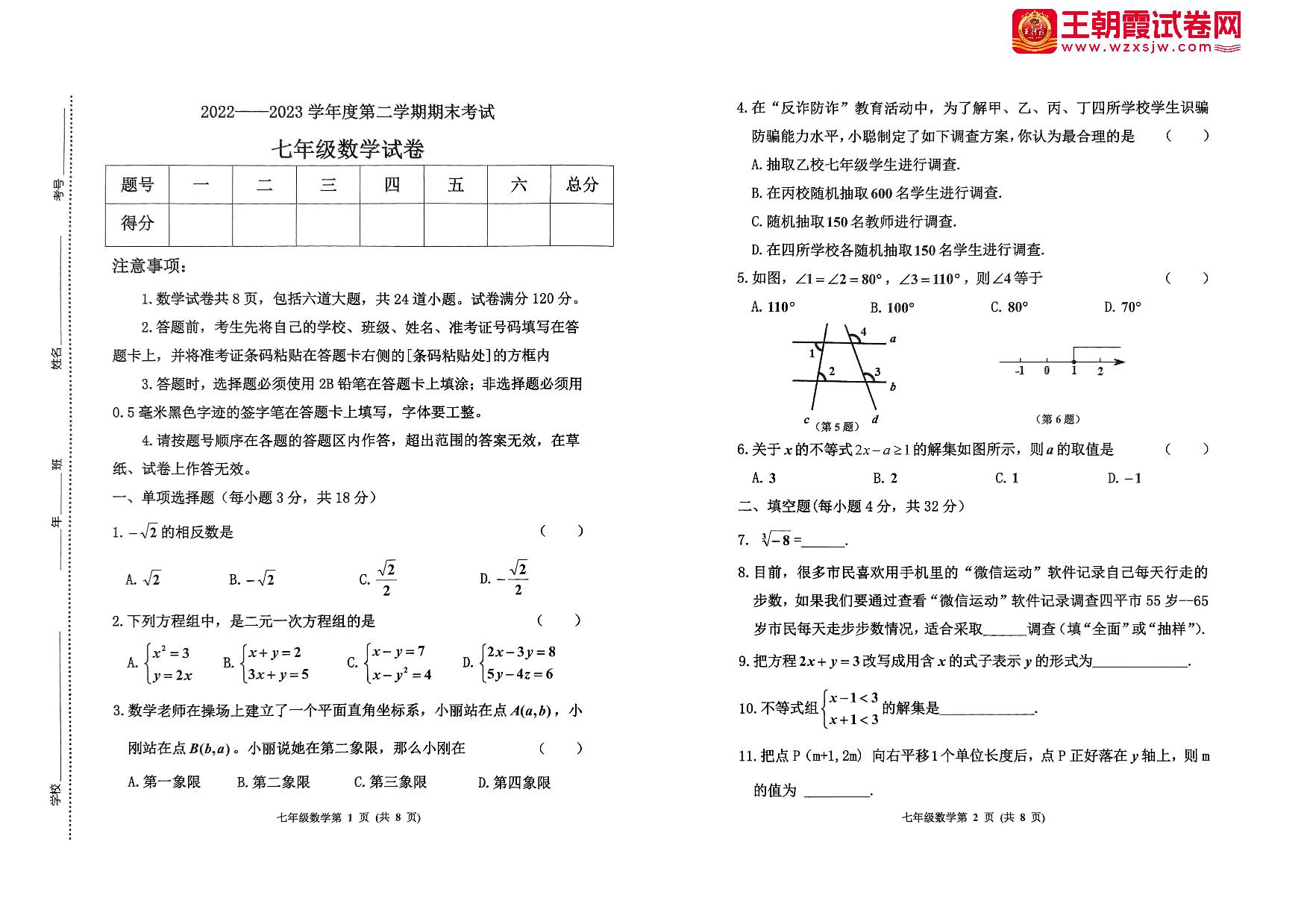 吉林省四平市伊通满族自治县2022-2023学年度第二学期期末考试七年级数学试卷(人教版)