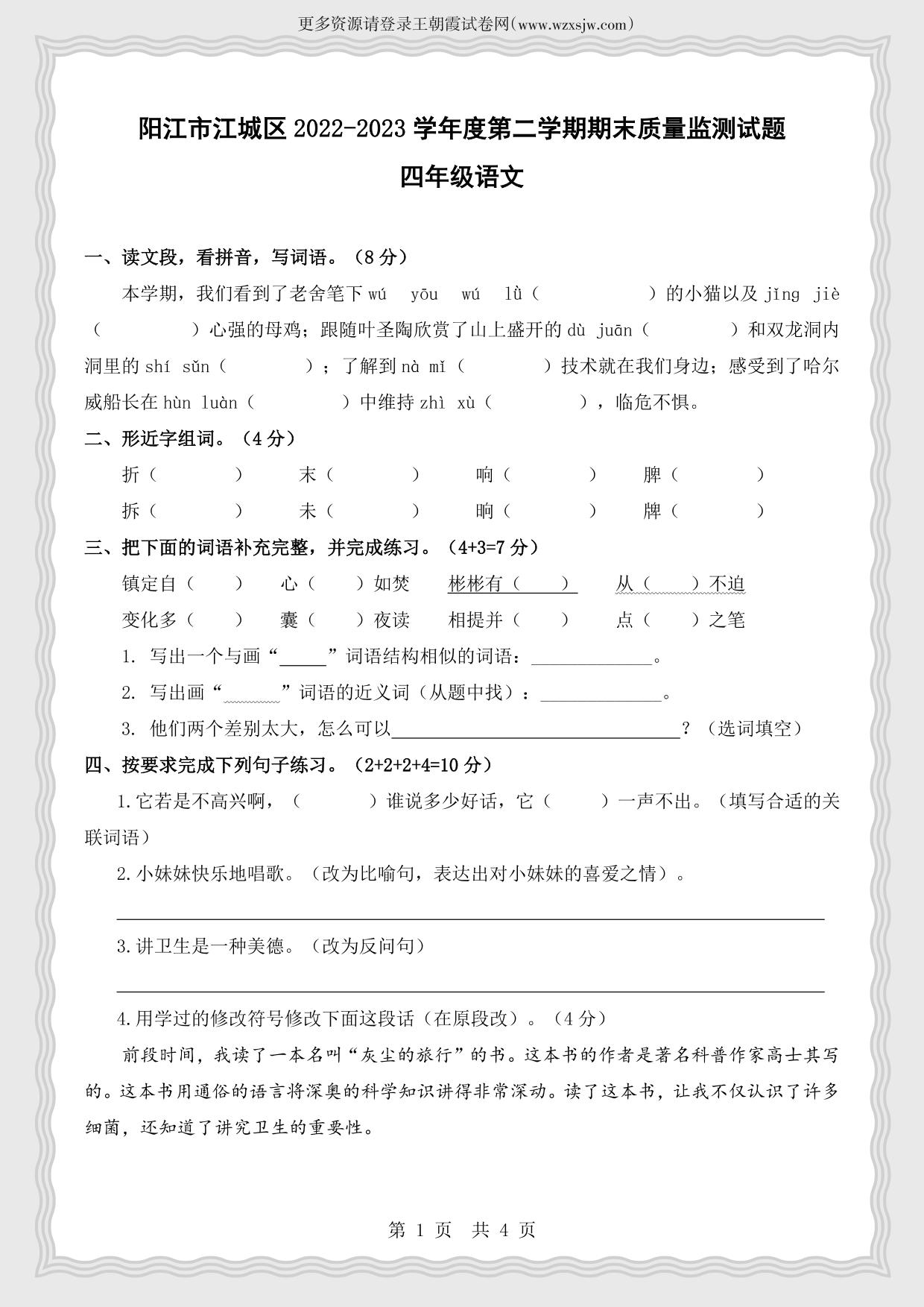 广东省阳江市江城区学年度第二学期期末质量监测试题四年级语文(人教版)