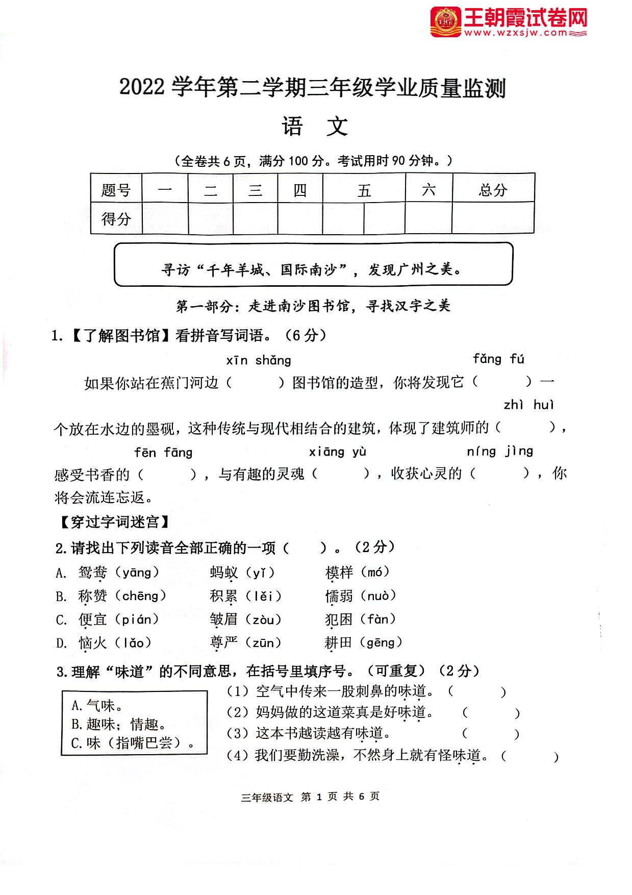广东省广州市南沙区2022-2023学年第二学期期末学业质量监测三年级语文(人教版)