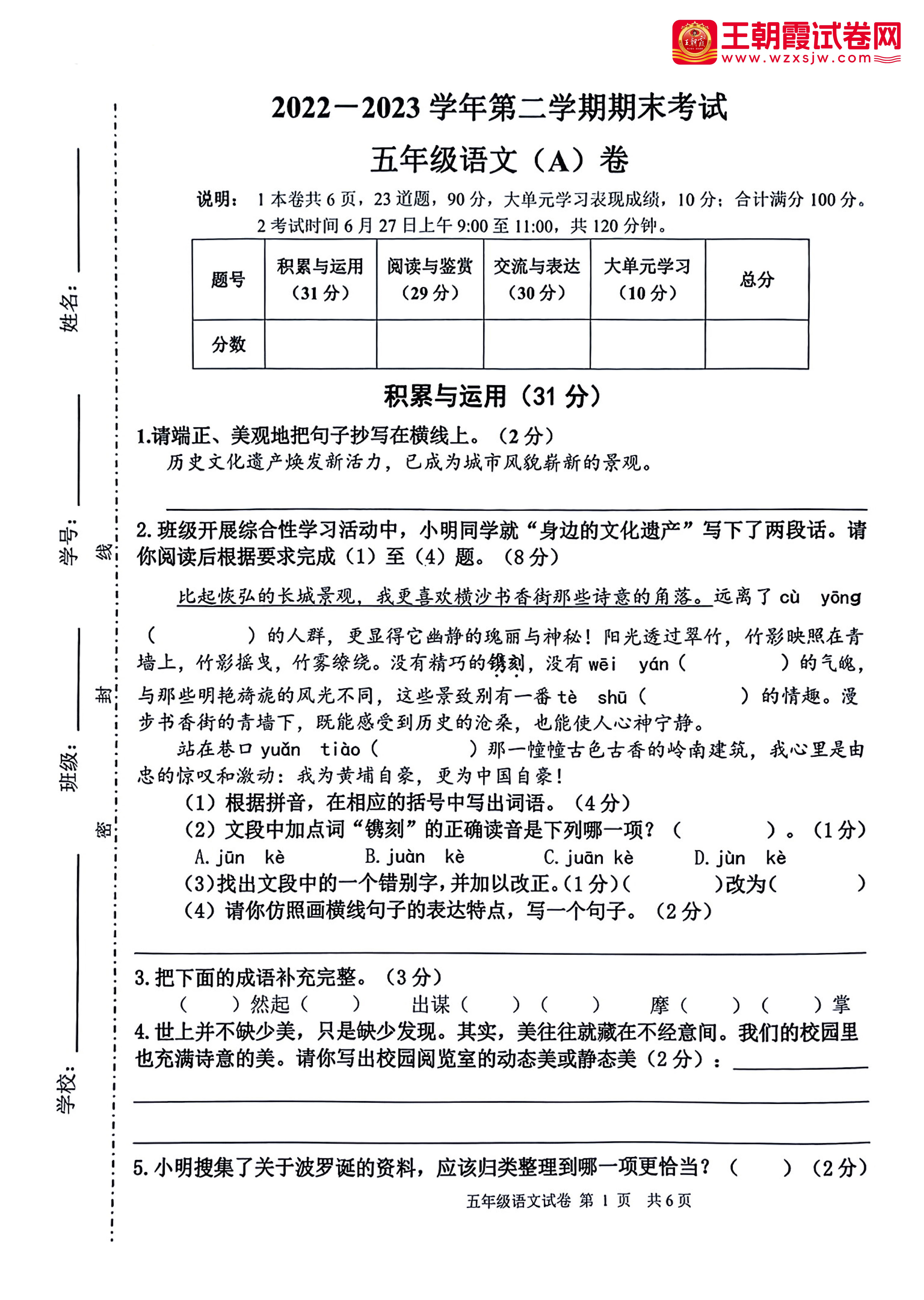 五年级语文人教版下册期末卷