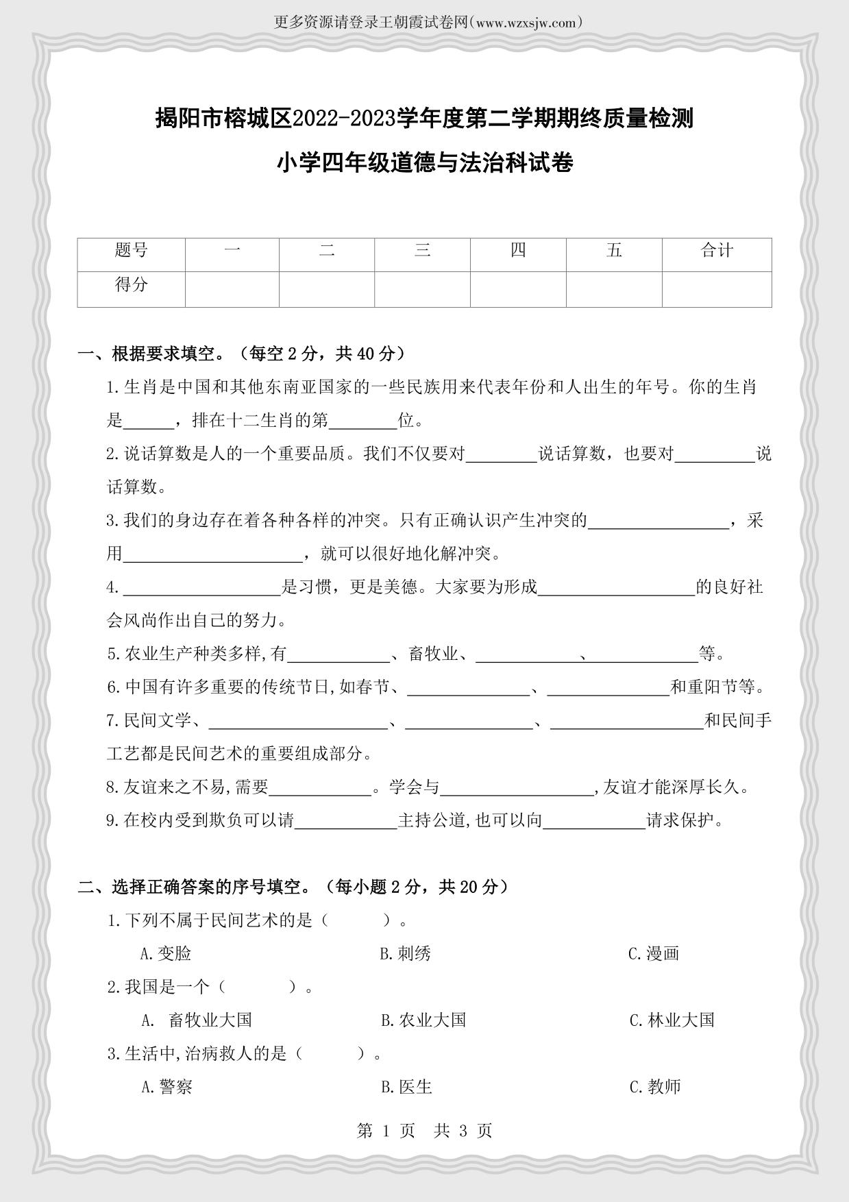 广东省揭阳市榕城区2022-2023学年第二学期期终质量检测试卷四年级道德与法治(人教版)