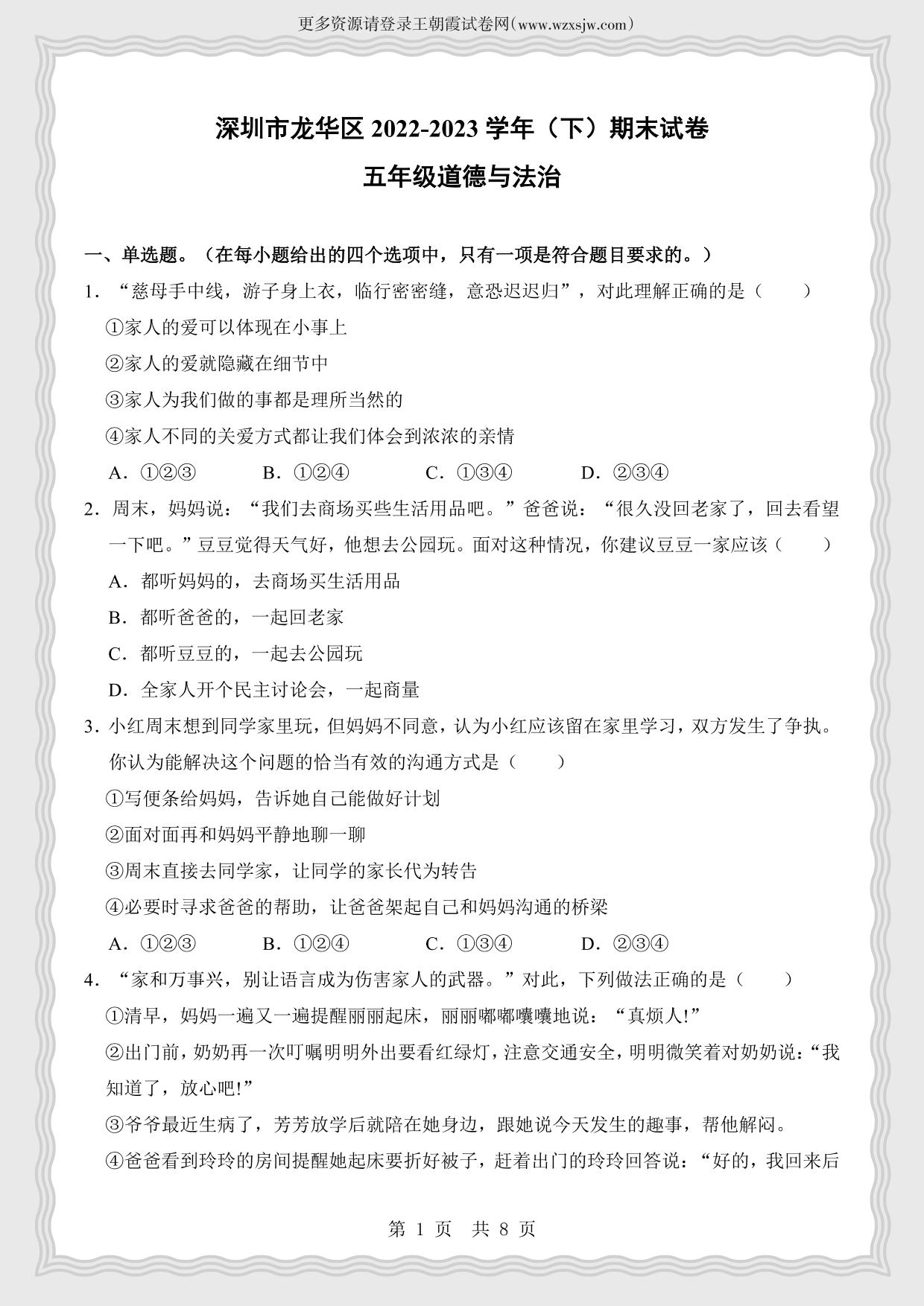 广东省深圳市龙华区2022-2023学年下学期期末试卷五年级道德与法治(人教版)