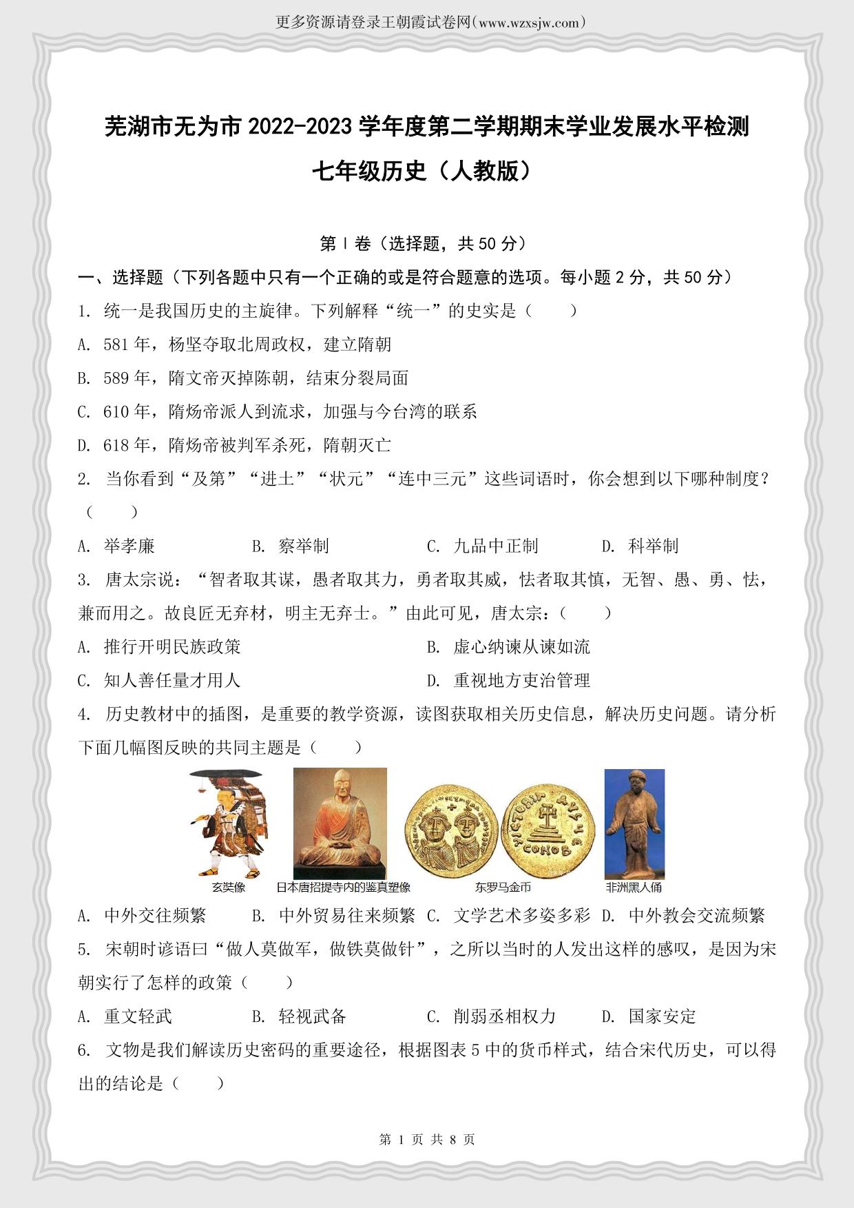 安徽省芜湖市无为市2022-2023学年度第二学期期末学业发展水平检测七年级历史(人教版)