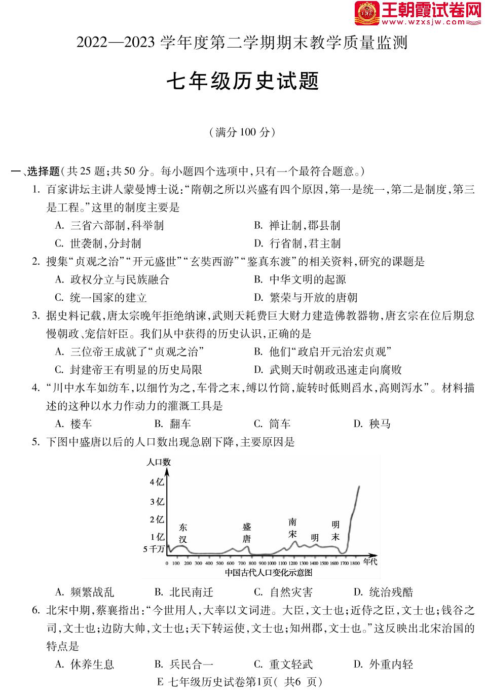 安徽省宣城市2022-2023学年度第二学期期末教学质量监测七年级历史(人教版)