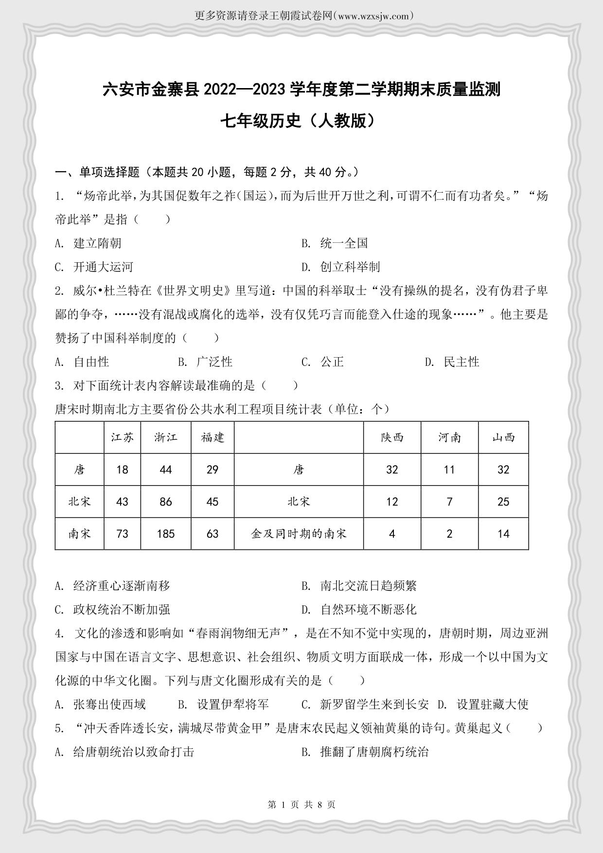安徽省六安市金寨县2022-2023学年度第二学期期末质量监测七年级历史(人教版)