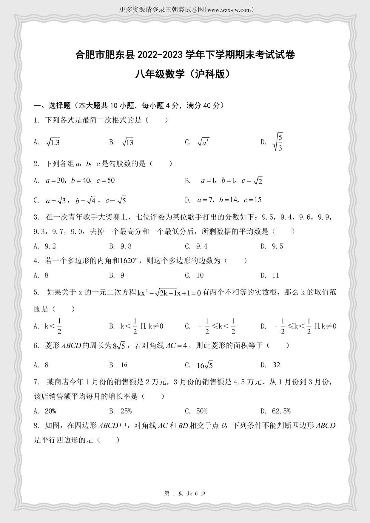安徽省合肥市肥东县2022-2023学年下学期期末考试试卷八年级数学(沪科版)