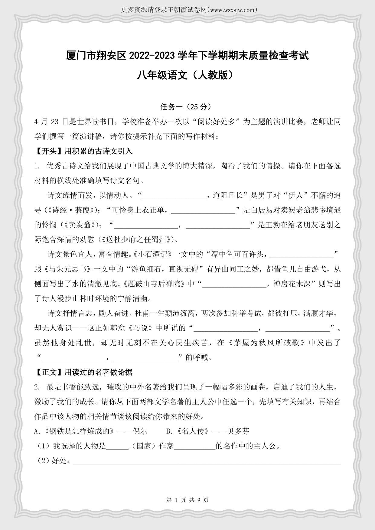 福建省厦门市翔安区2022-2023学年下学期期末质量检查考试八年级语文(人教版)