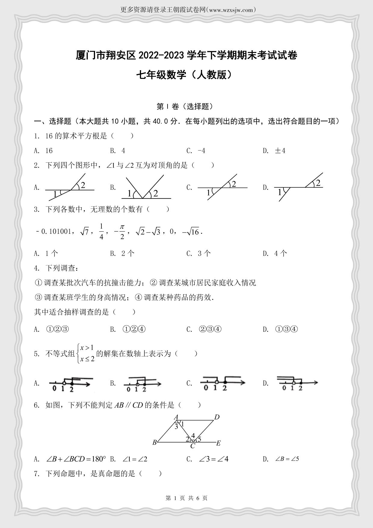 福建省厦门市翔安区2022-2023学年下学期期末考试试卷七年级数学(人教版)