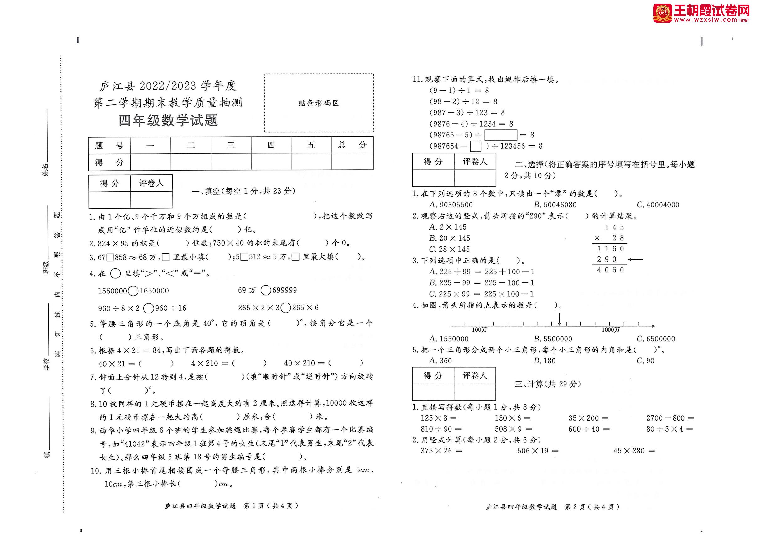 安徽省合肥市庐江县2022-2023学年度第二学期期末教学质量抽测四年级数学(苏教版)