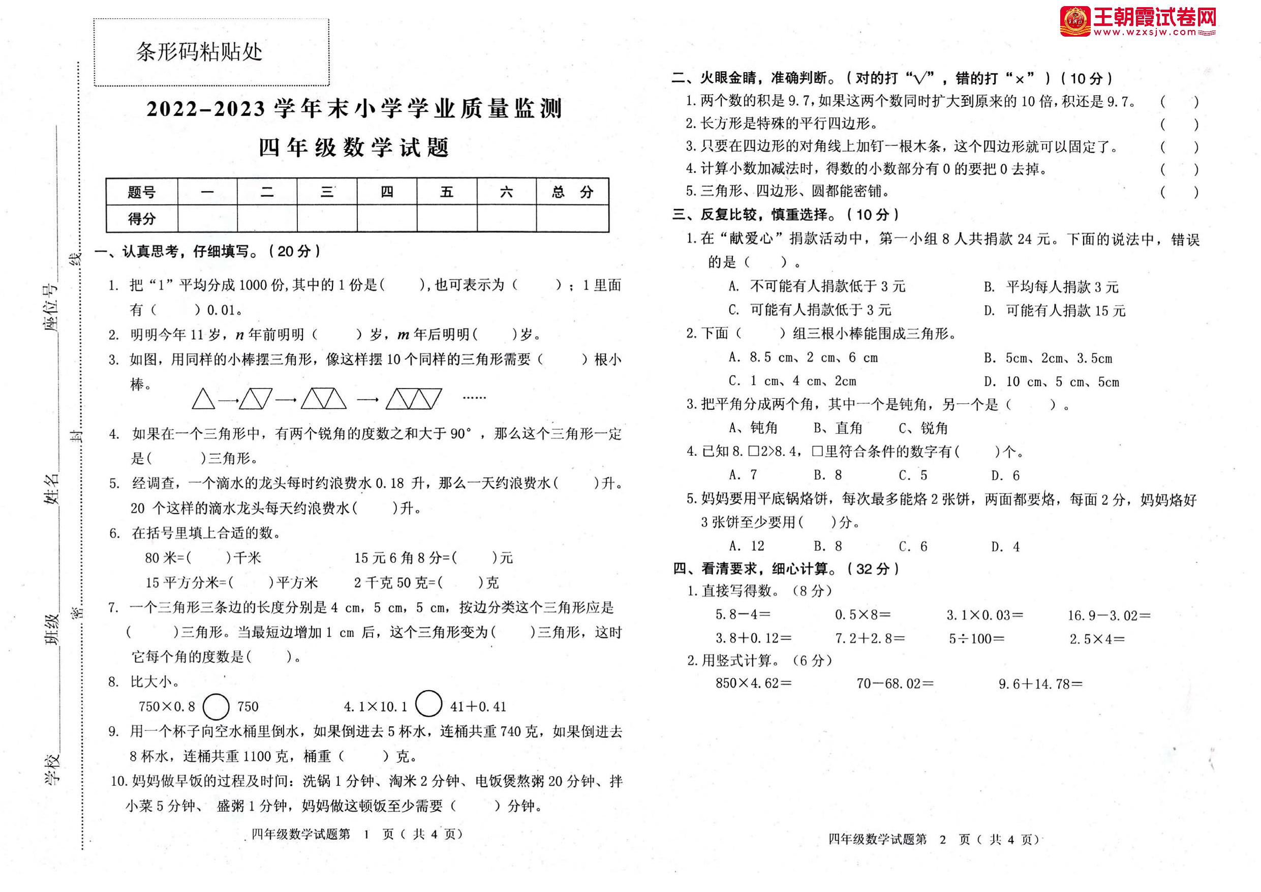 安徽省安庆市宜秀区2022-2023学年下学期期末学业质量监测四年级数学(北师版)