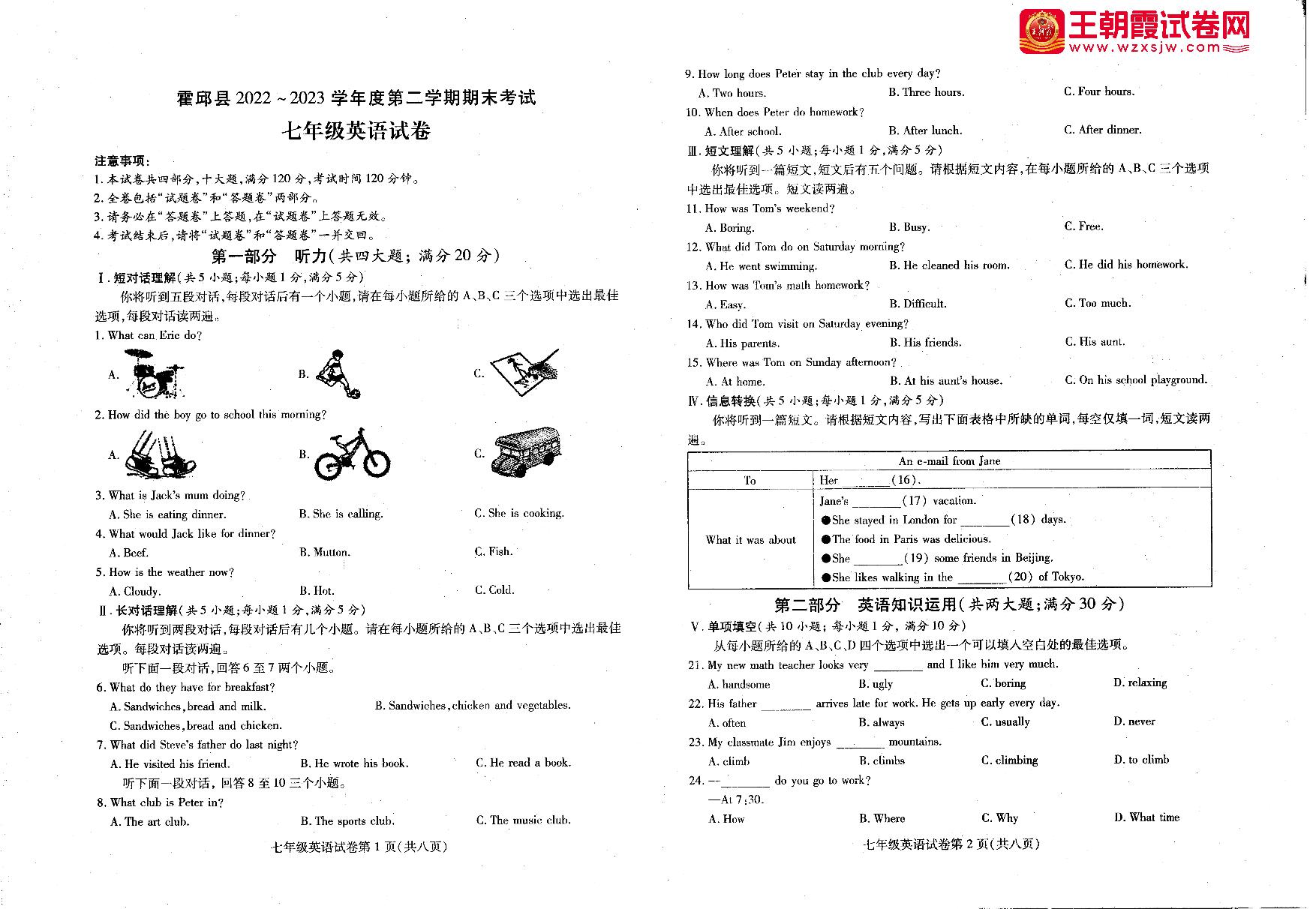 安徽省六安市霍邱县2022-2023学年度第二学期期末考试七年级英语(人教版)